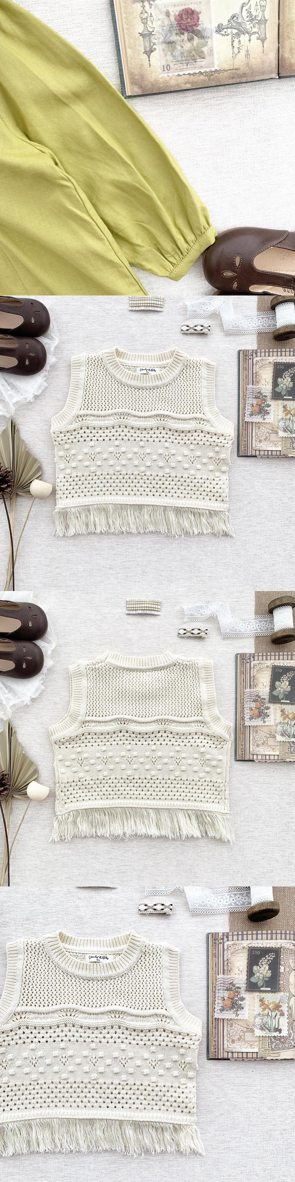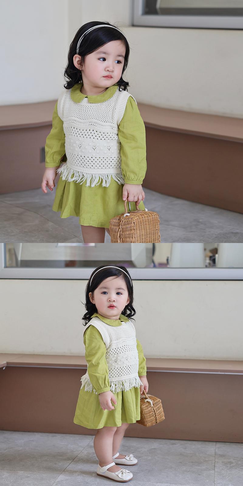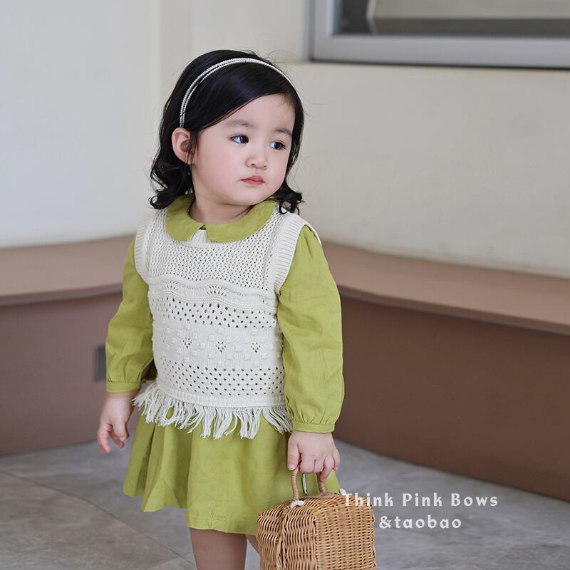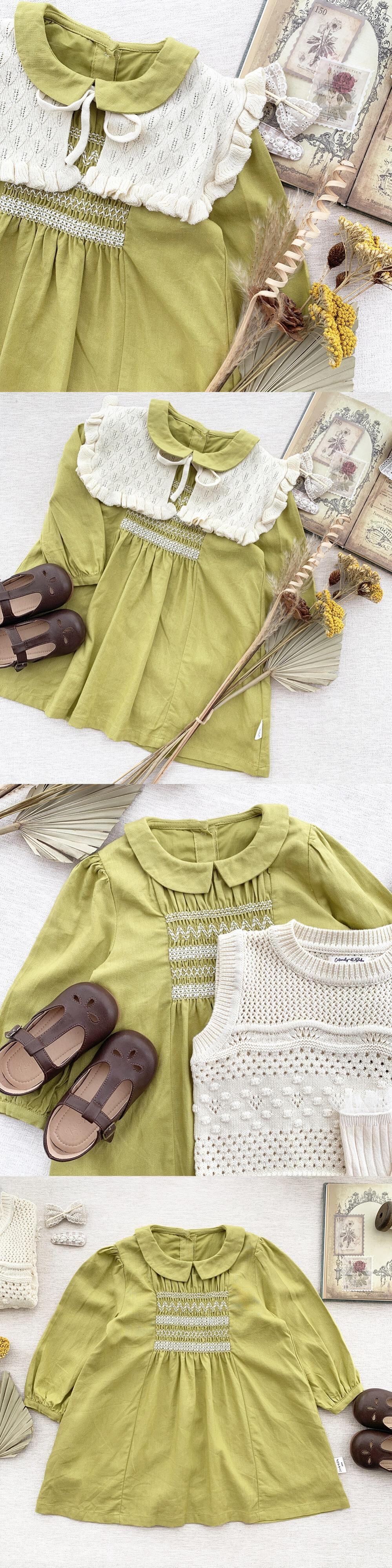 色:黄緑色のドレス,ホワイトニットベスト