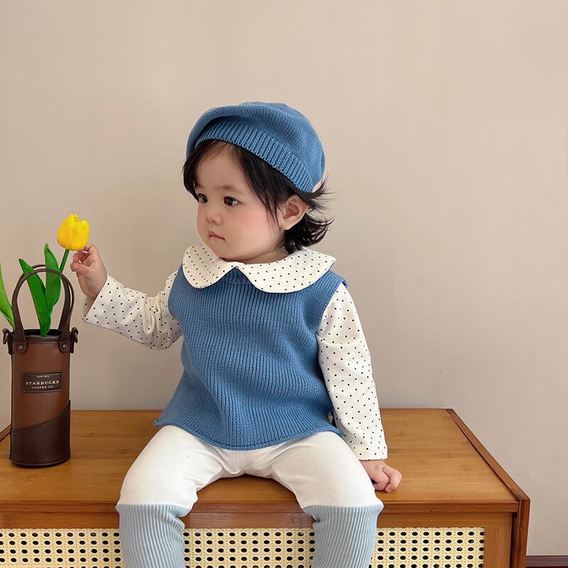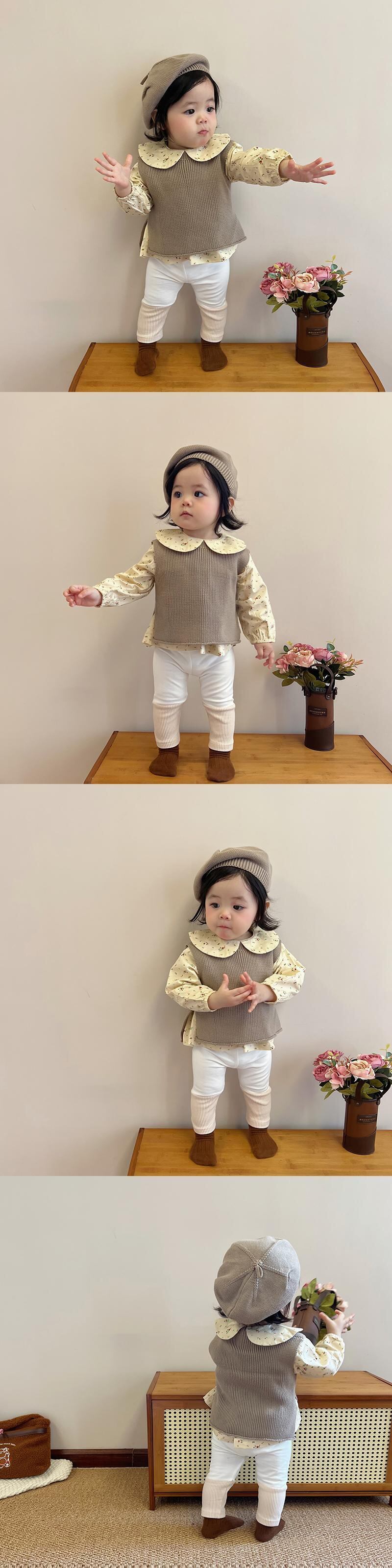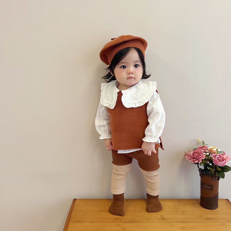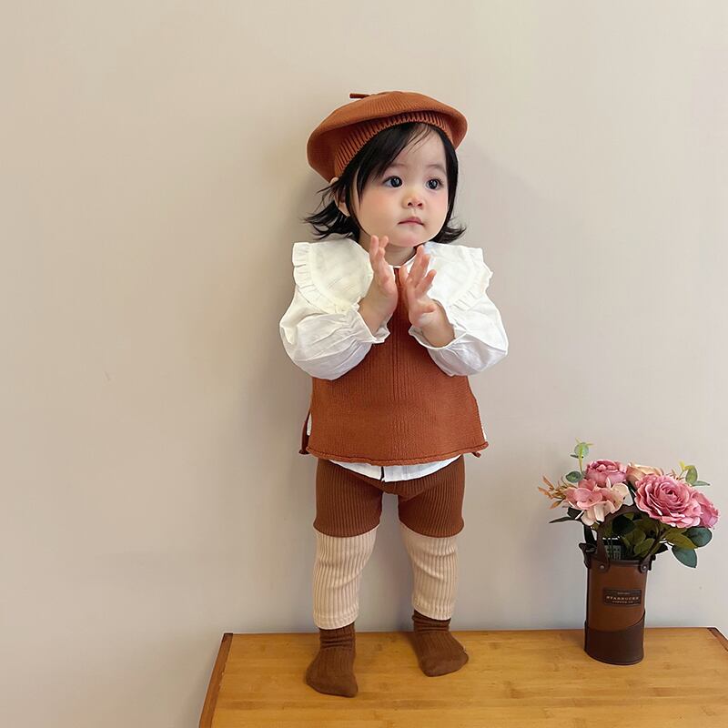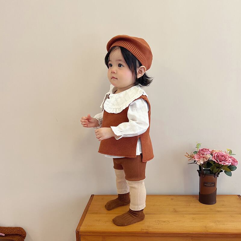 色:ブラウンベスト,ライトブラウンベスト,青いベスト,青いレギンス,アプリコットレギンス,ブラウンレギンス,アプリコットフローラルトップ,白のシャツ,内側にドット,ブルーハットワンサイズ,ブラウンハットワンサイズ,ライトブラウンハットワンサイズ
