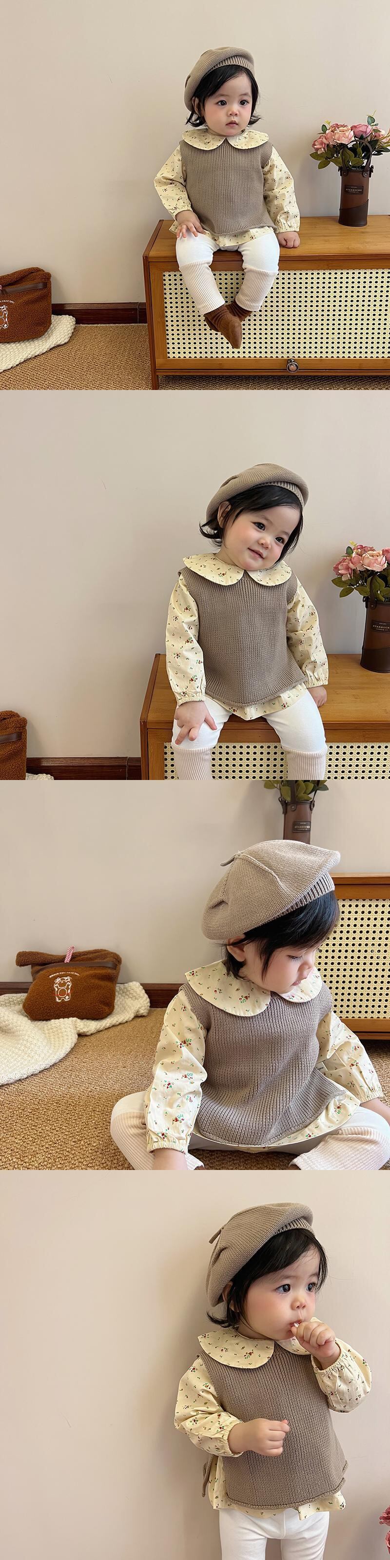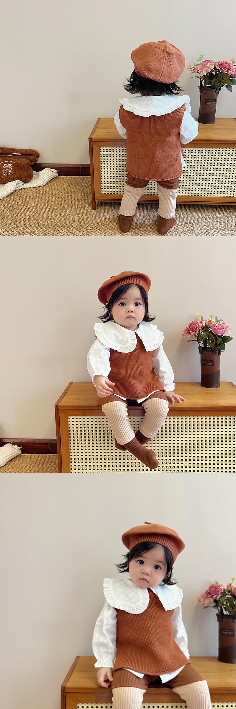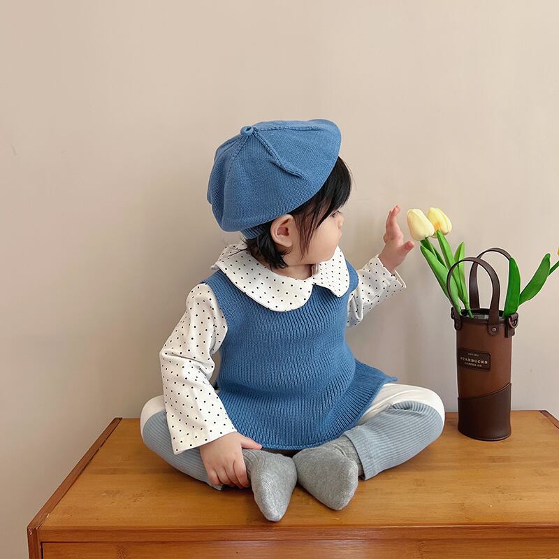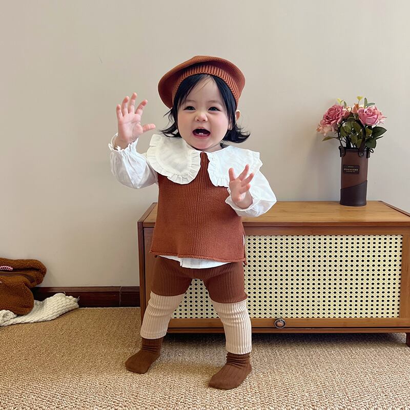 色:ブラウンベスト,ライトブラウンベスト,青いベスト,青いレギンス,アプリコットレギンス,ブラウンレギンス,アプリコットフローラルトップ,白のシャツ,内側にドット,ブルーハットワンサイズ,ブラウンハットワンサイズ,ライトブラウンハットワンサイズ