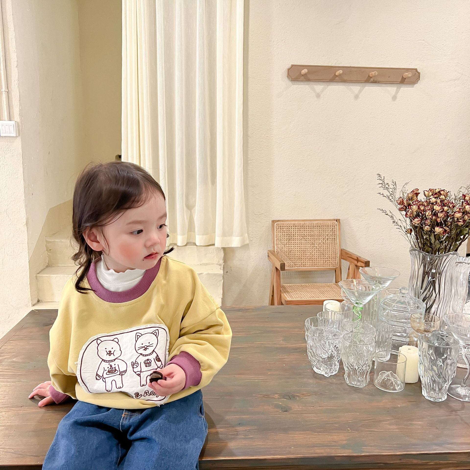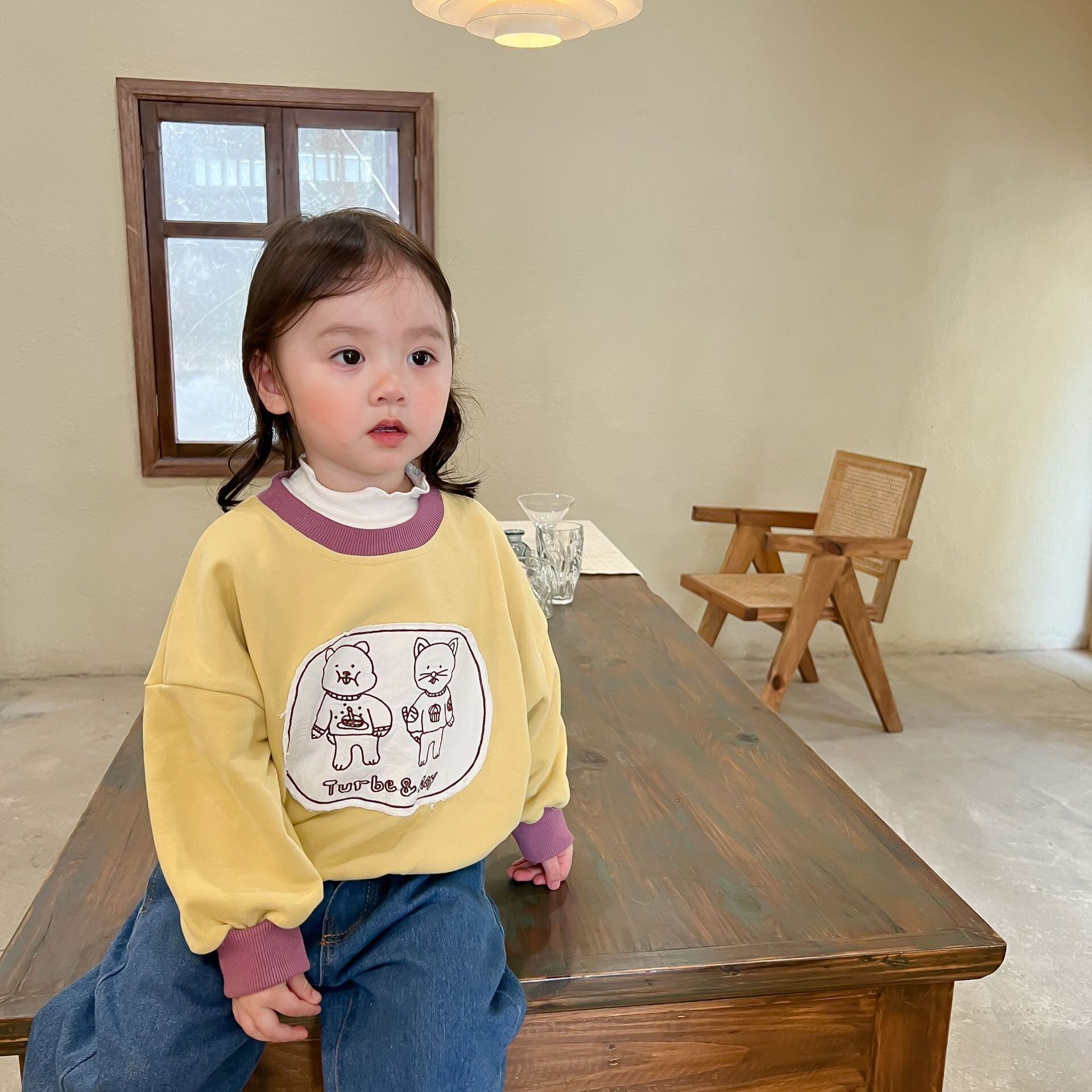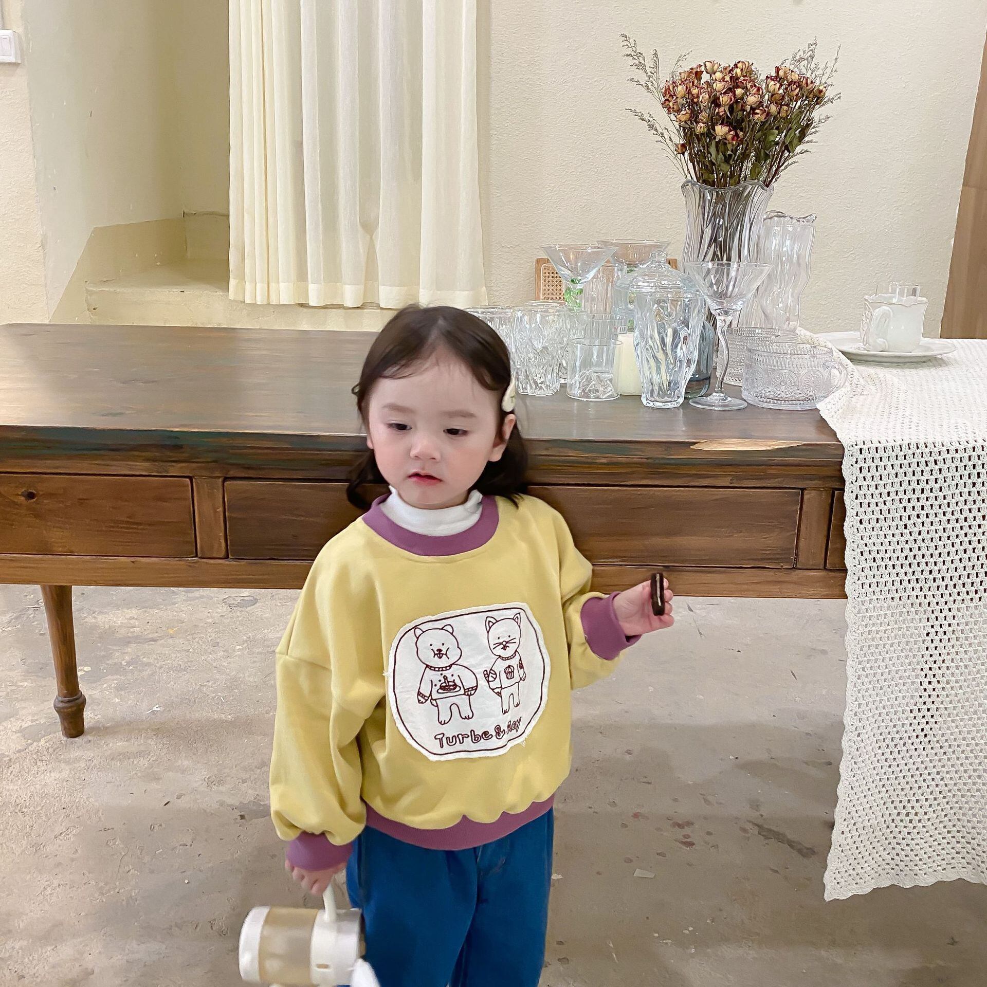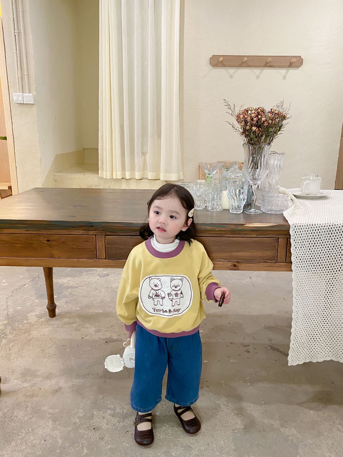 色:子猫のセーター,ブルージーンズ