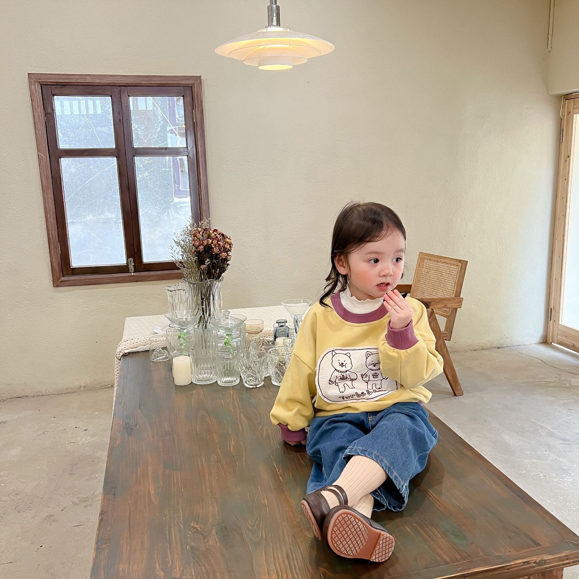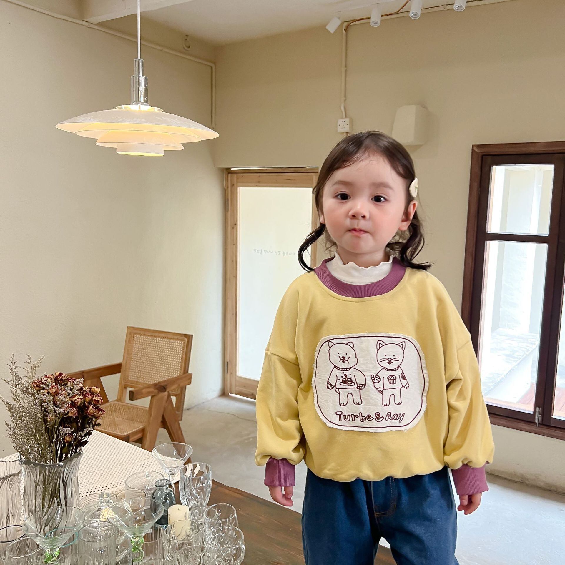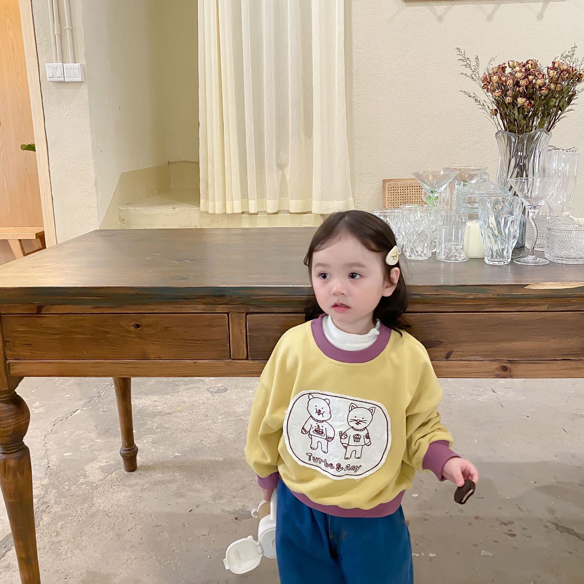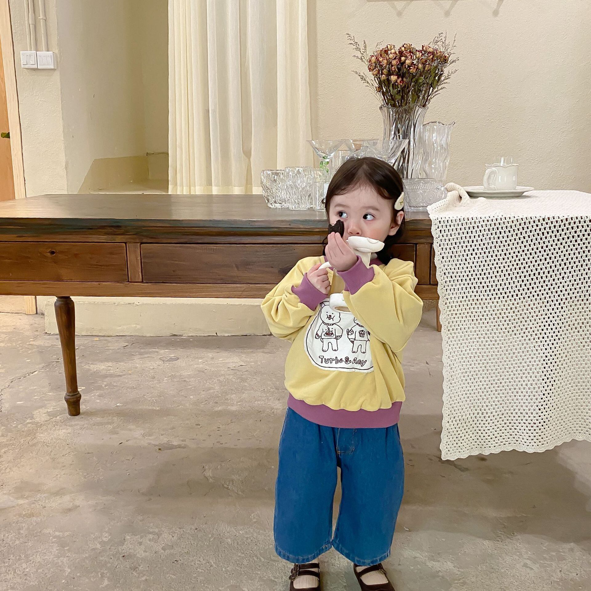 色:子猫のセーター,ブルージーンズ