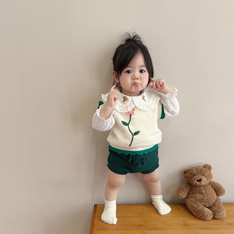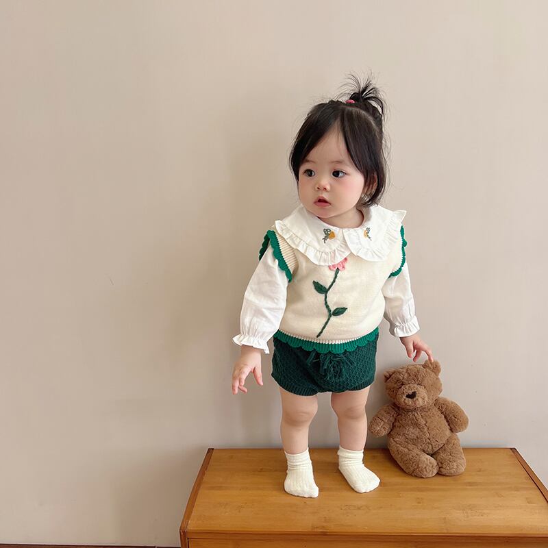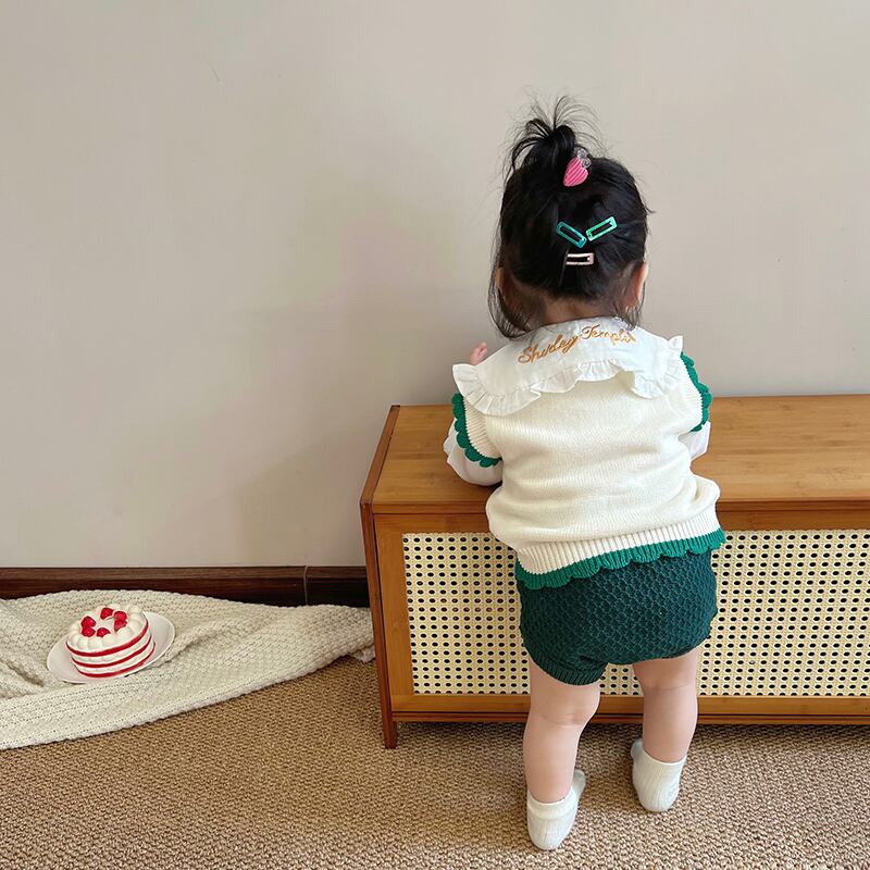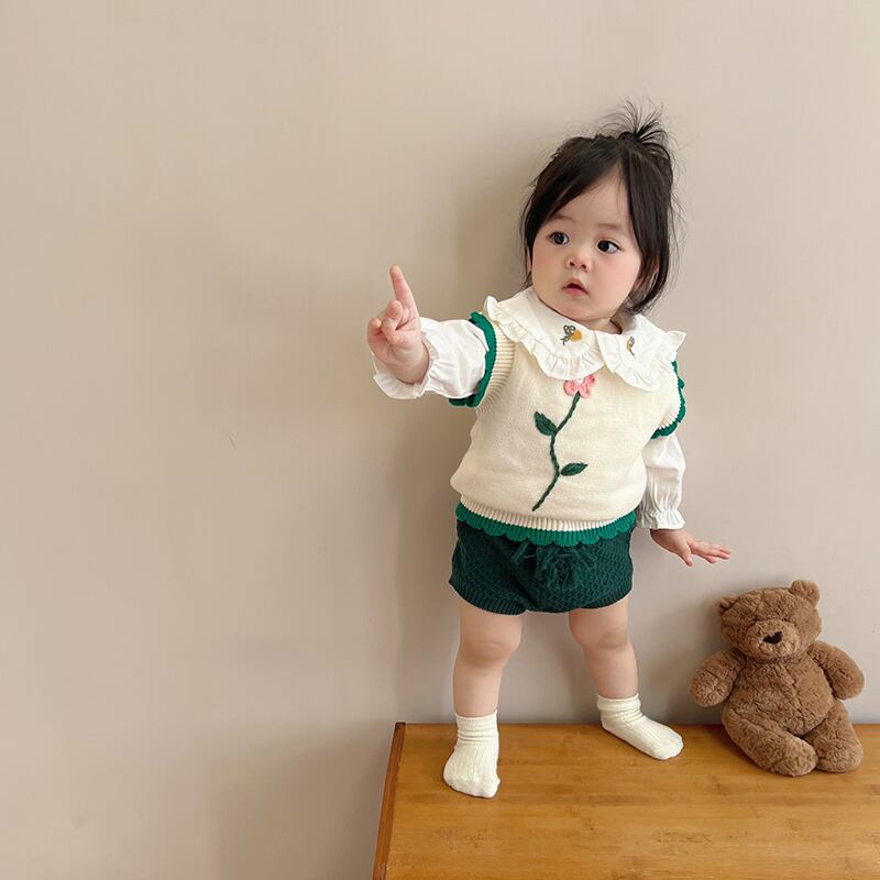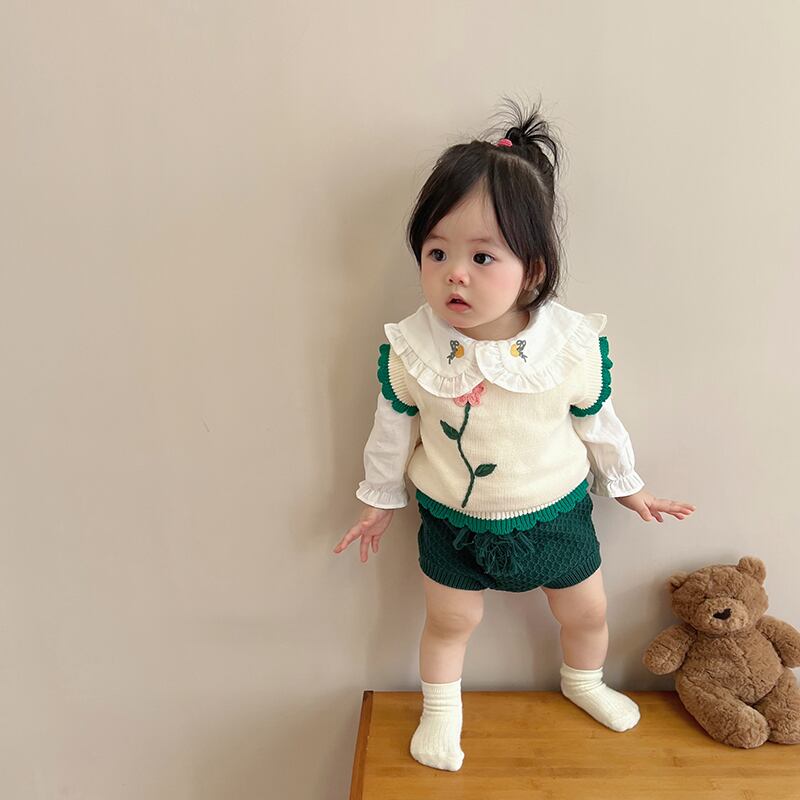 色:ホワイトアプリコットベスト,緑のパンパンツ,ラペルシャツ