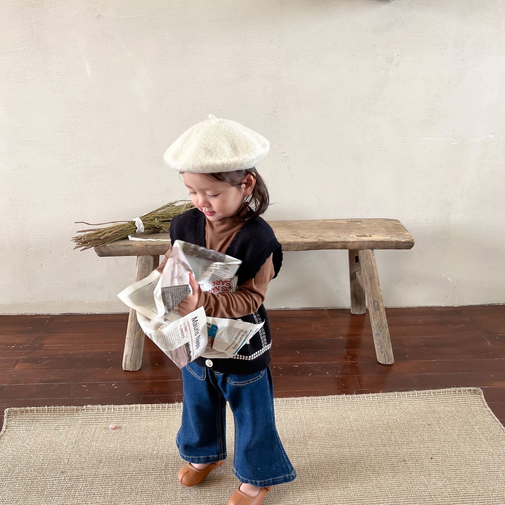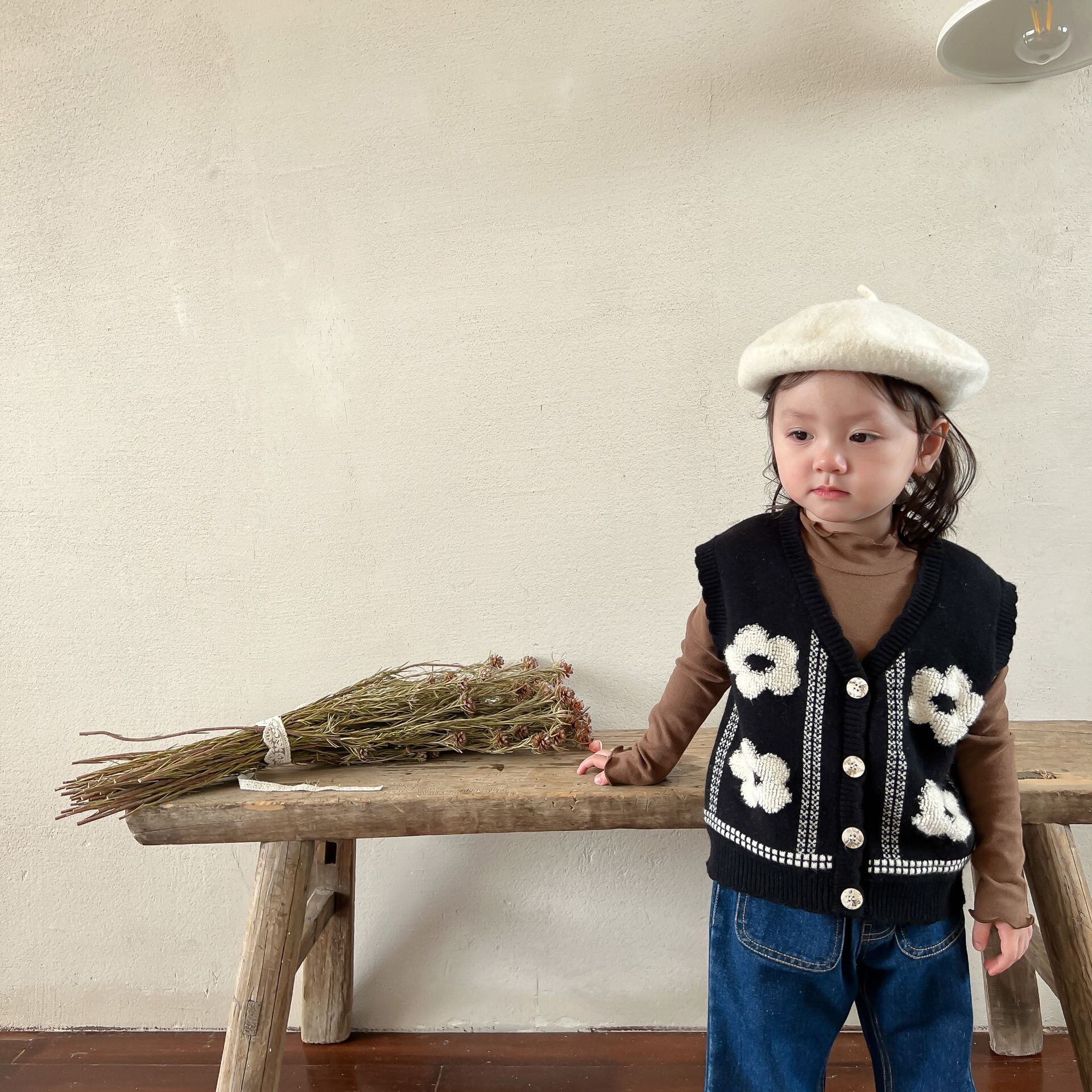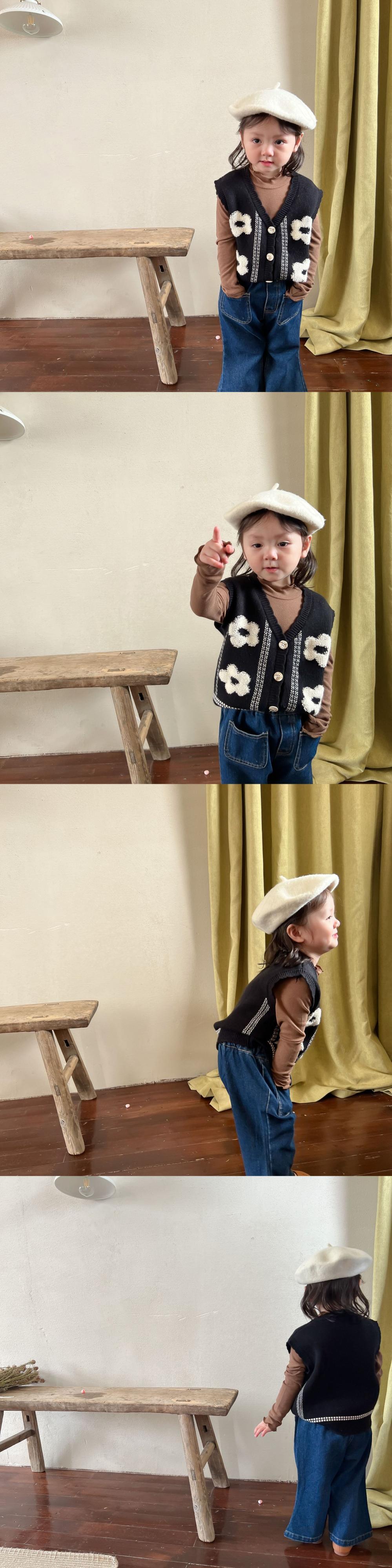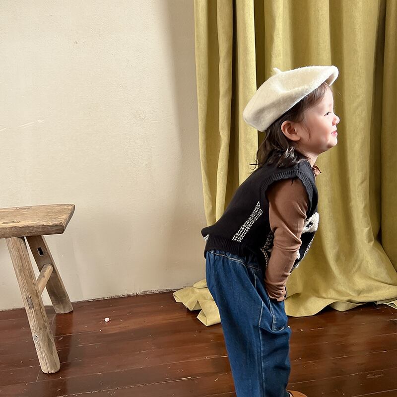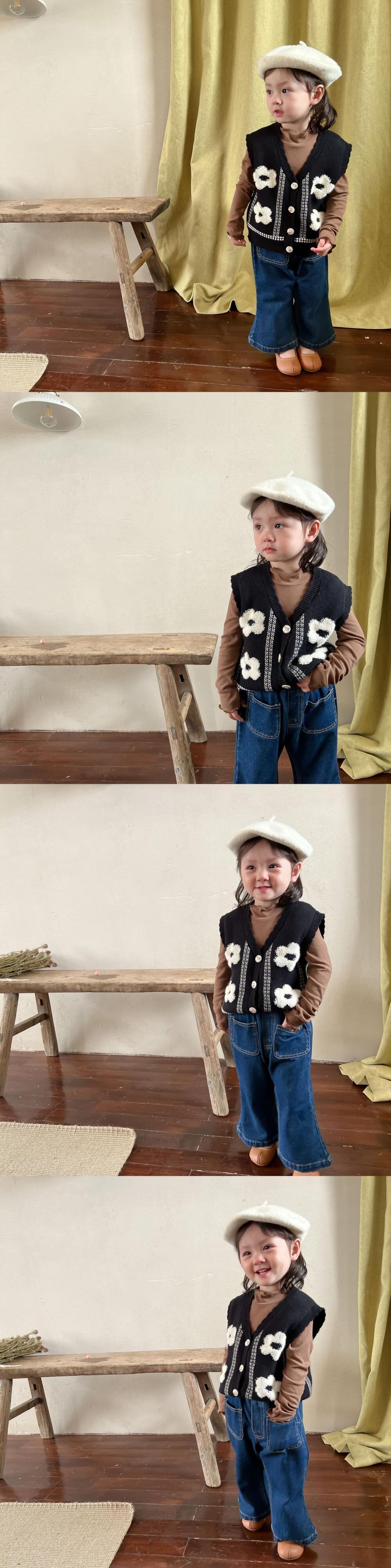 色:黒のベスト,ブラウンのボトミングシャツ,デニムフレアパンツ