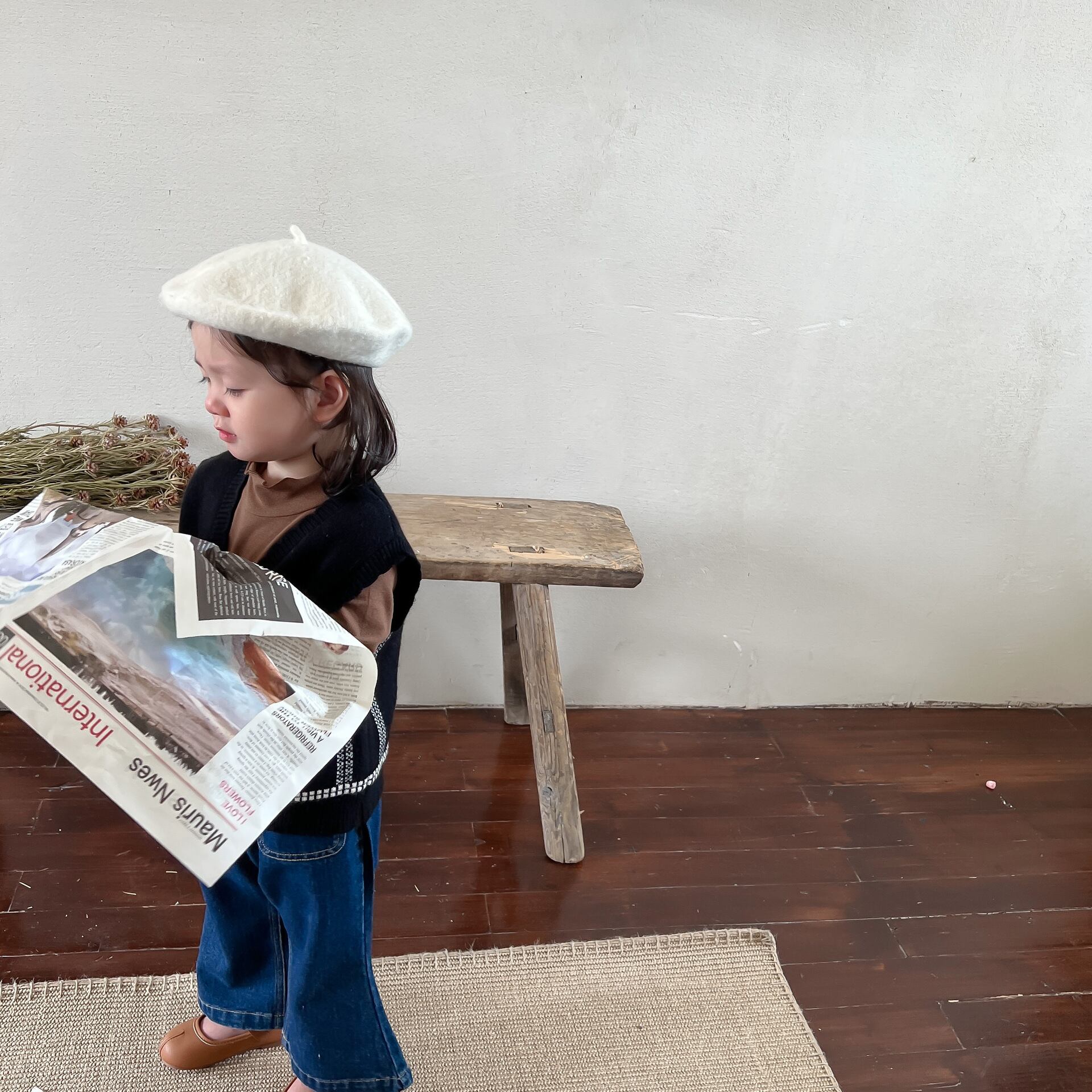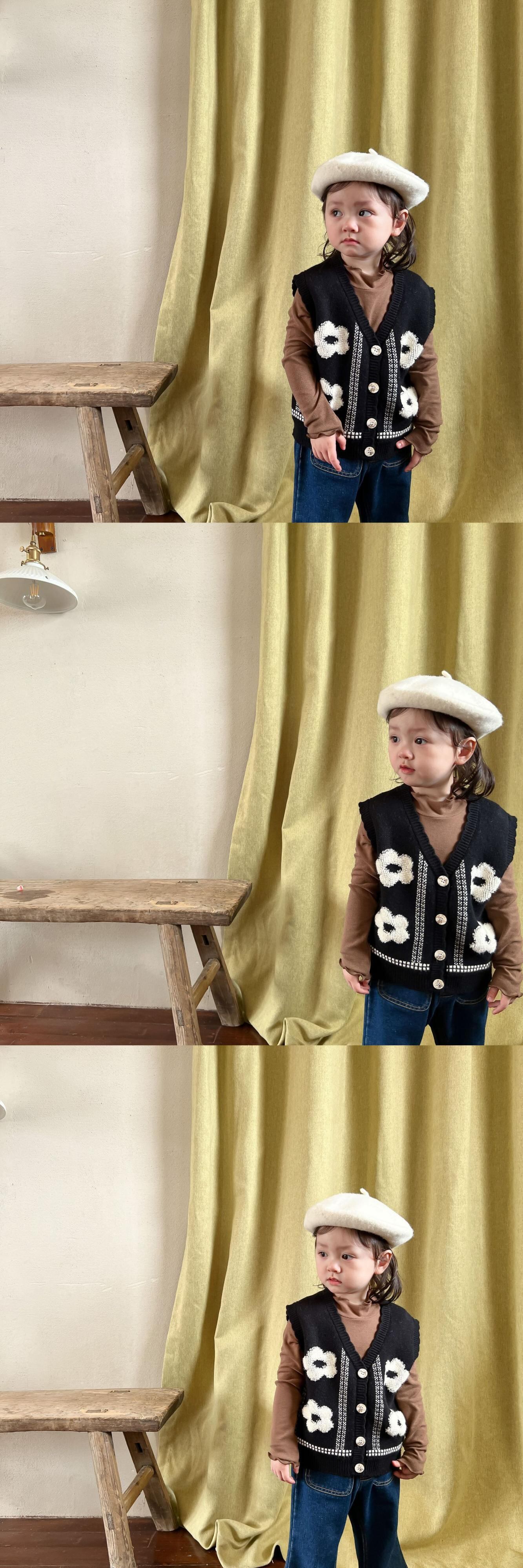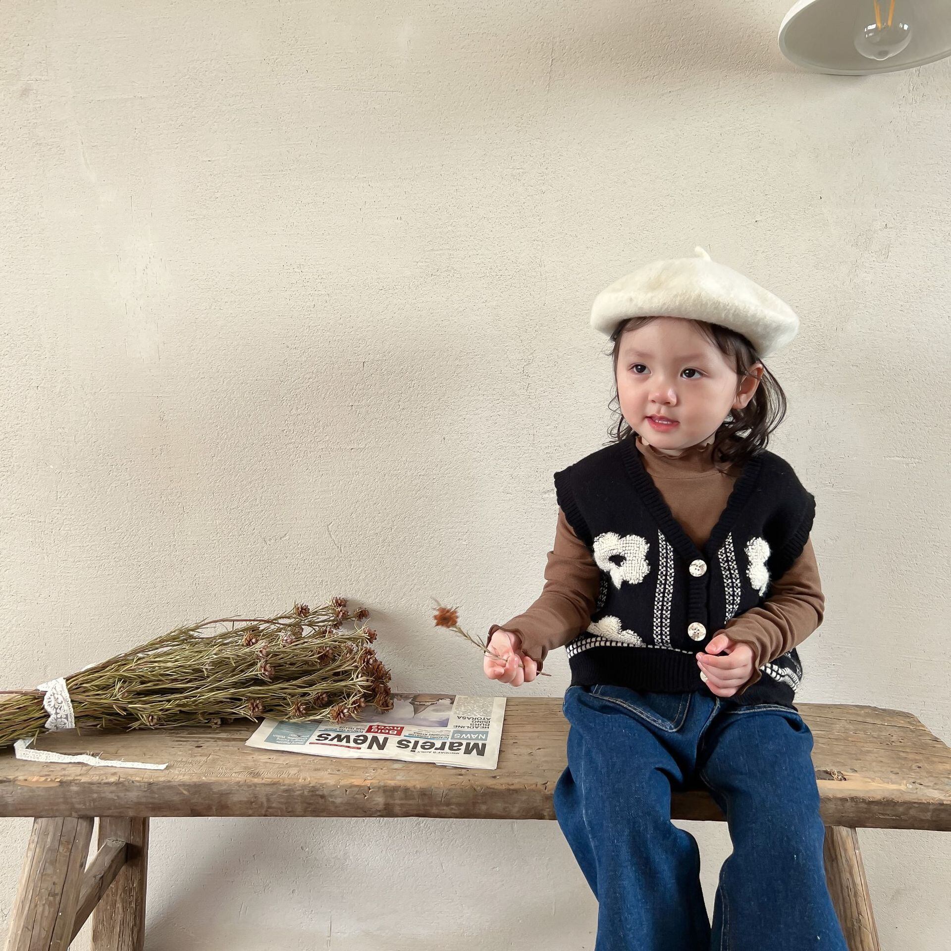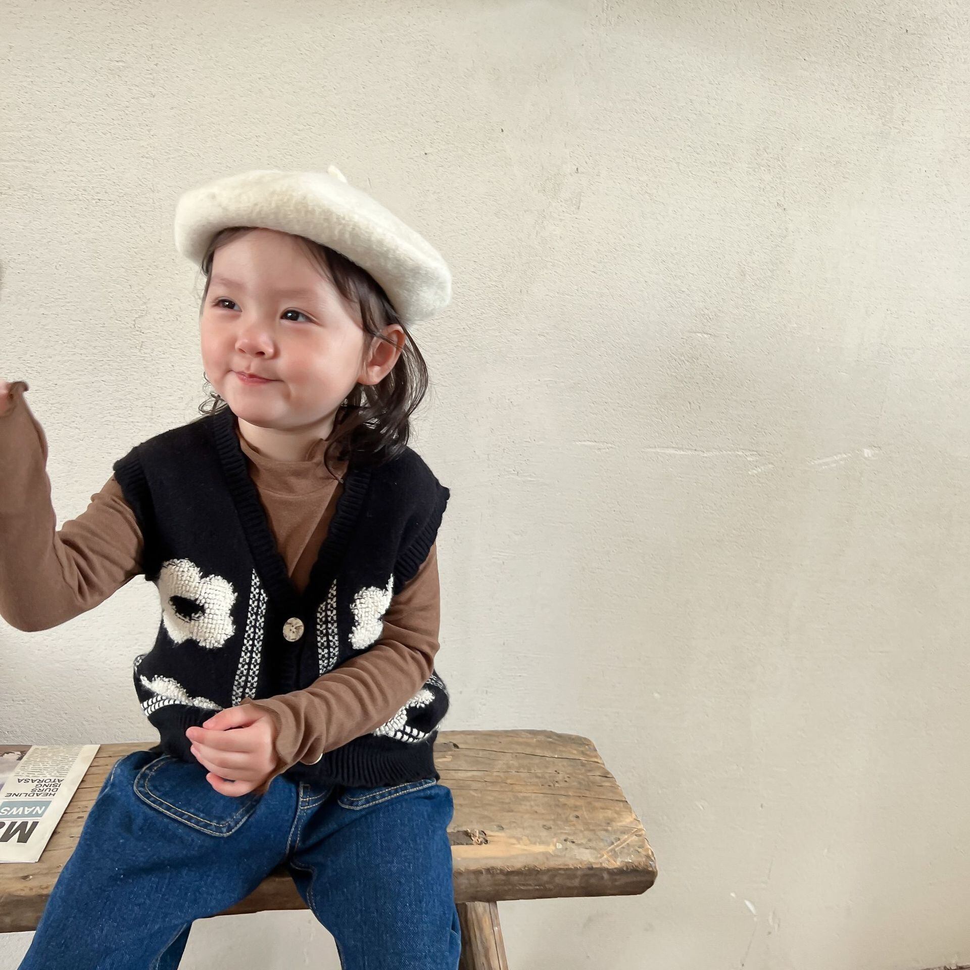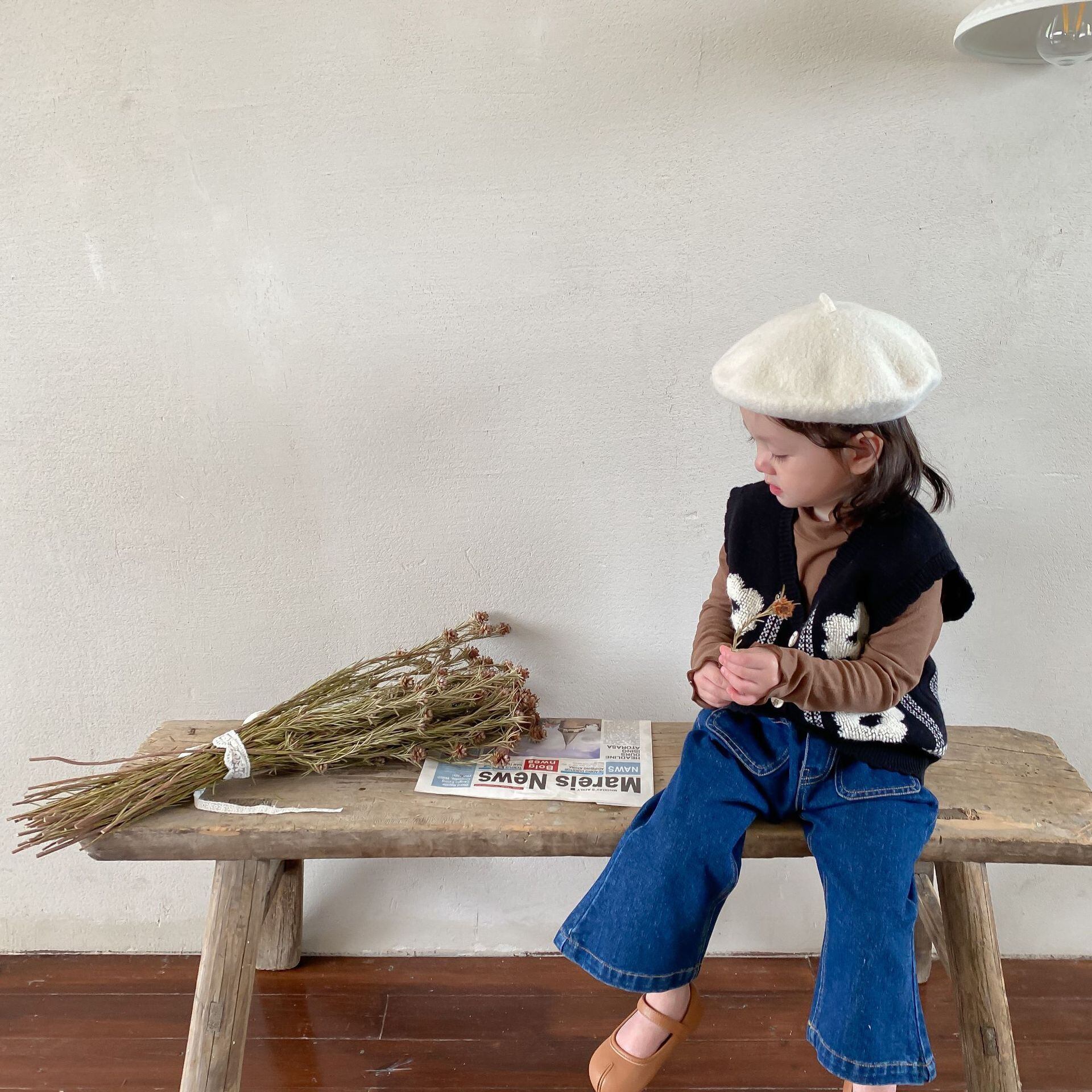 色:黒のベスト,ブラウンのボトミングシャツ,デニムフレアパンツ