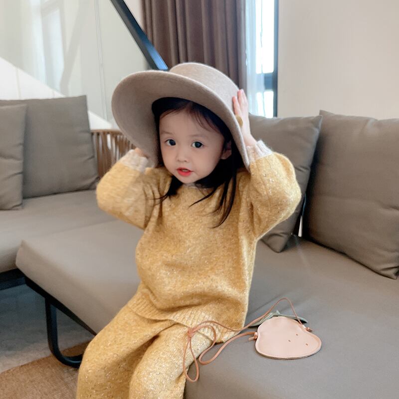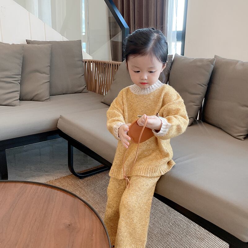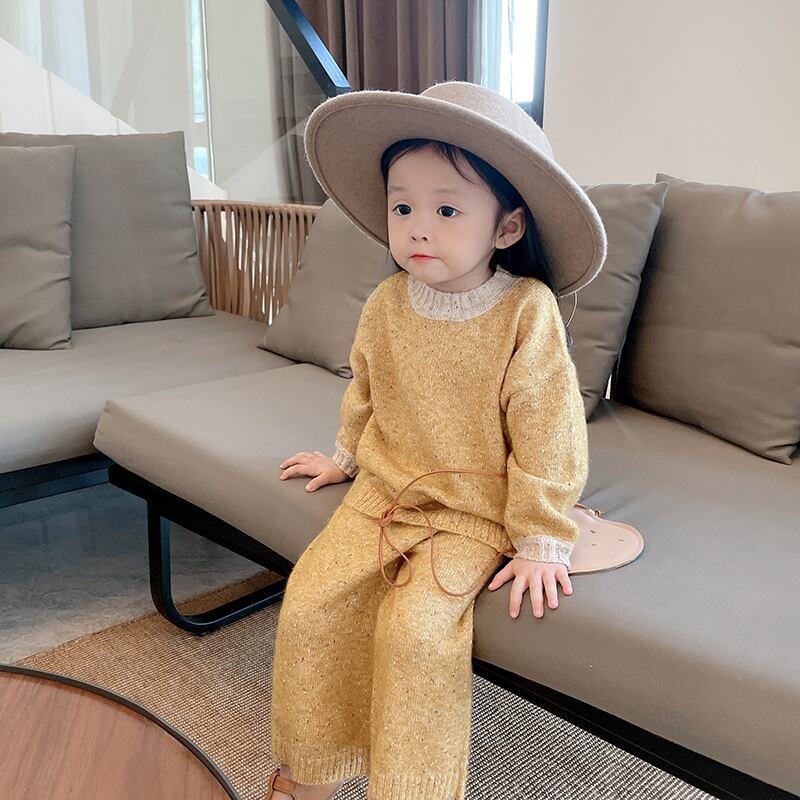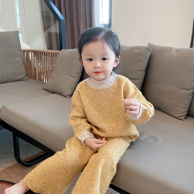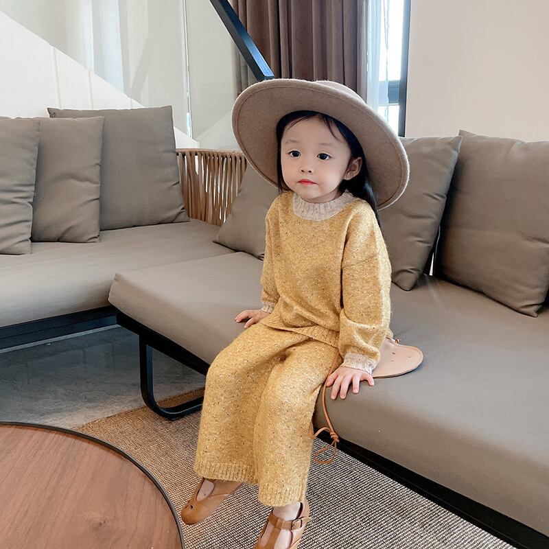 色:暖かい黄色のセーター,ニットパンツ