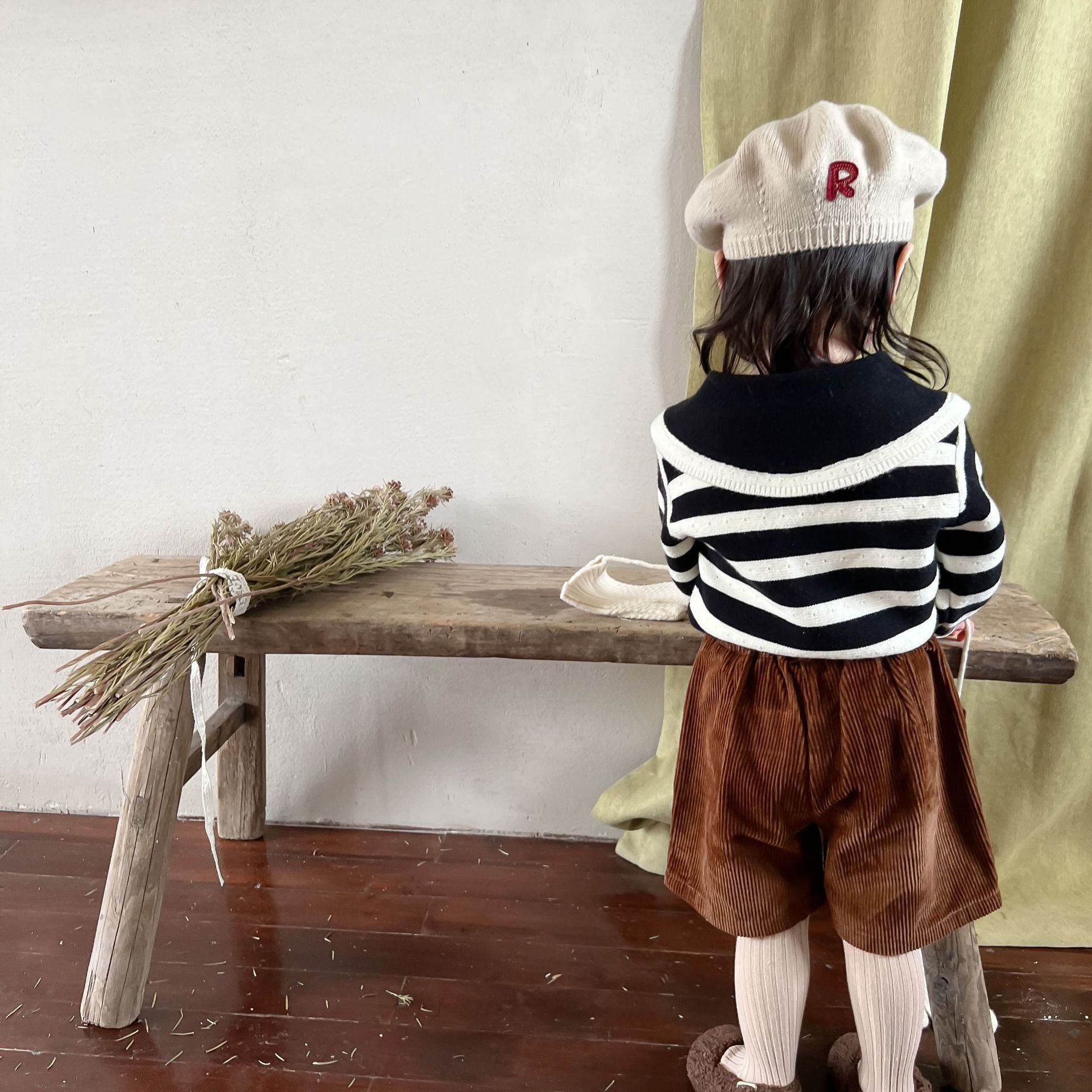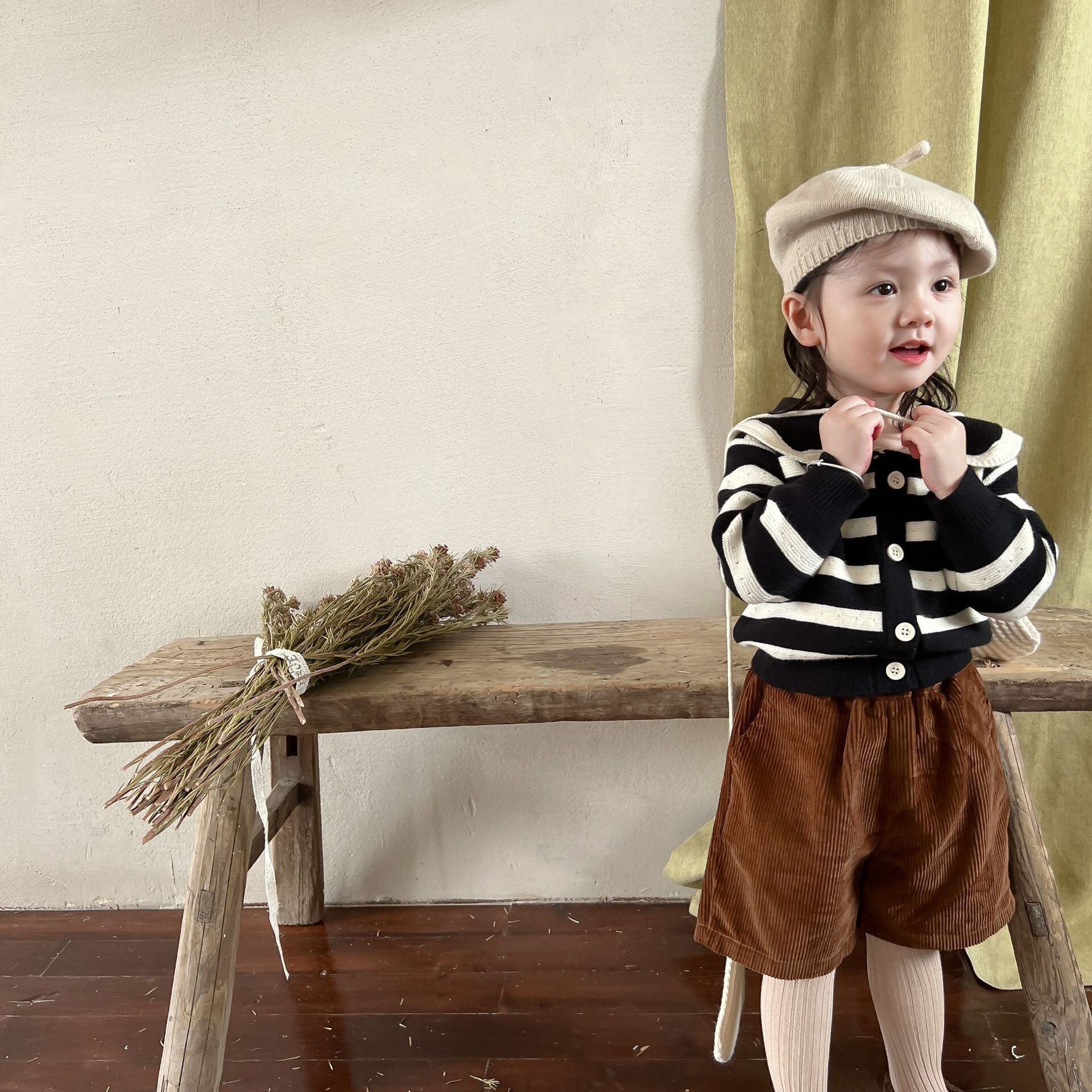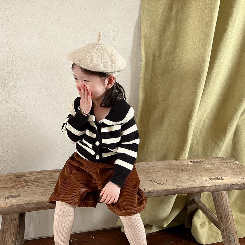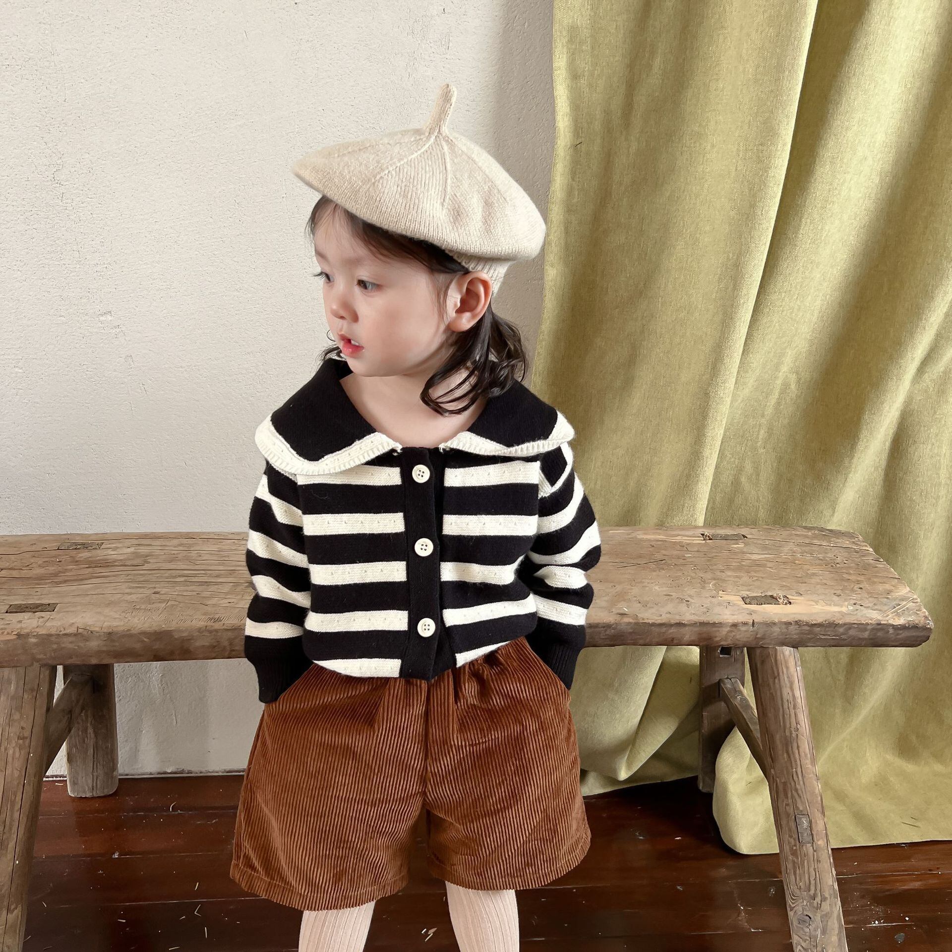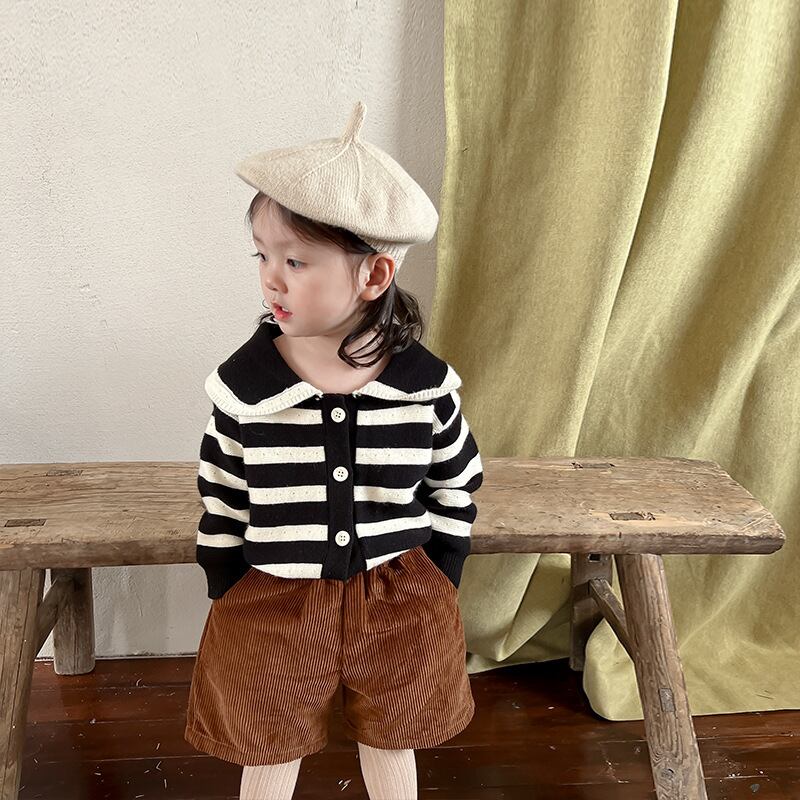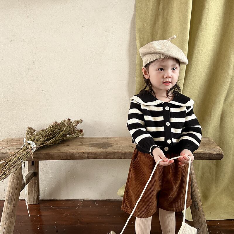 色:ブラックストライプセーター,コーデュロイショーツ