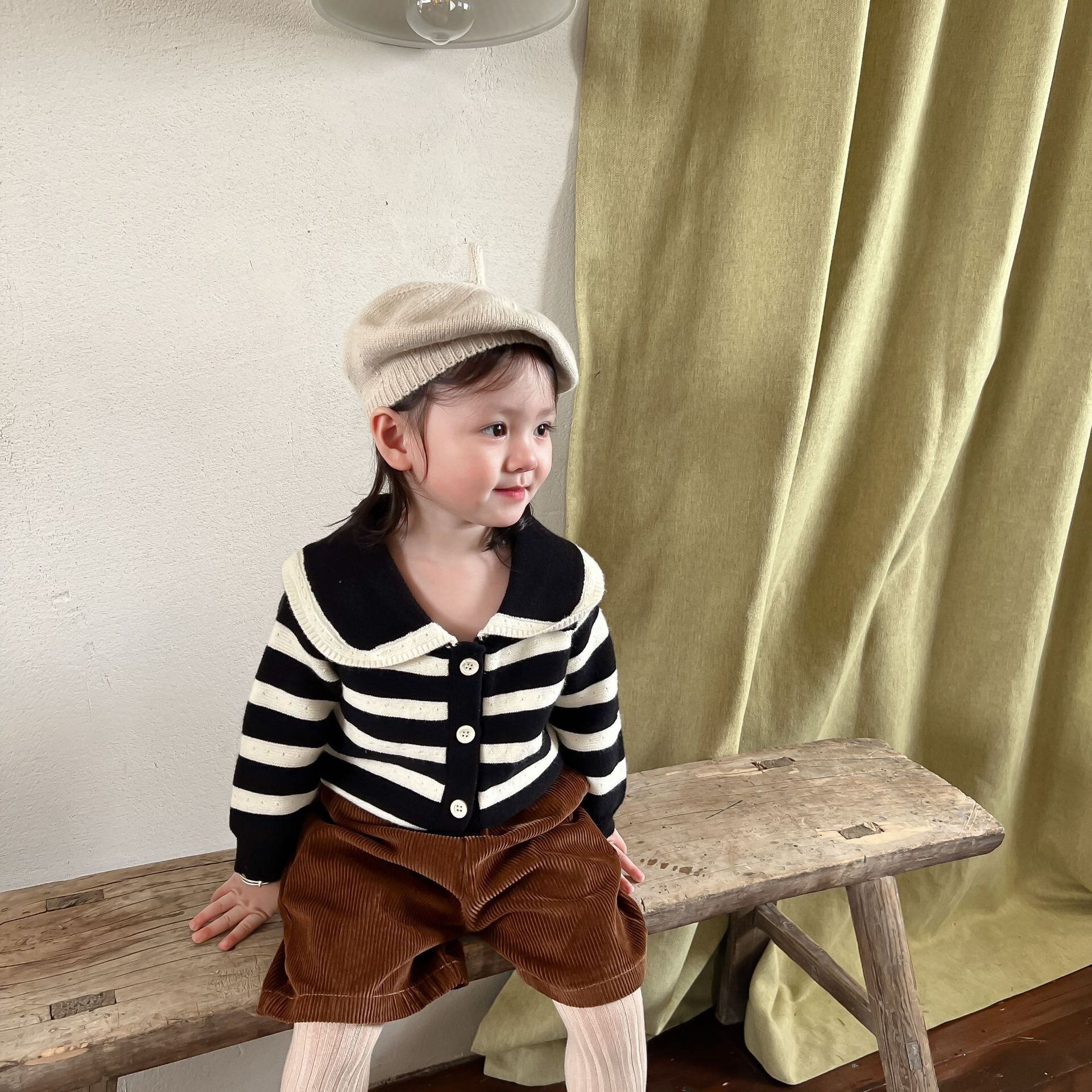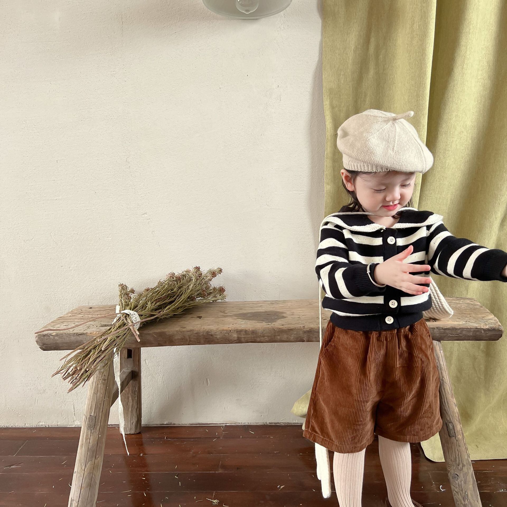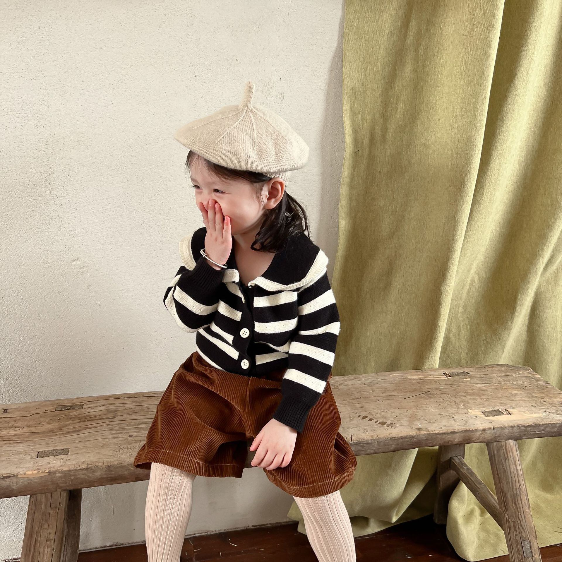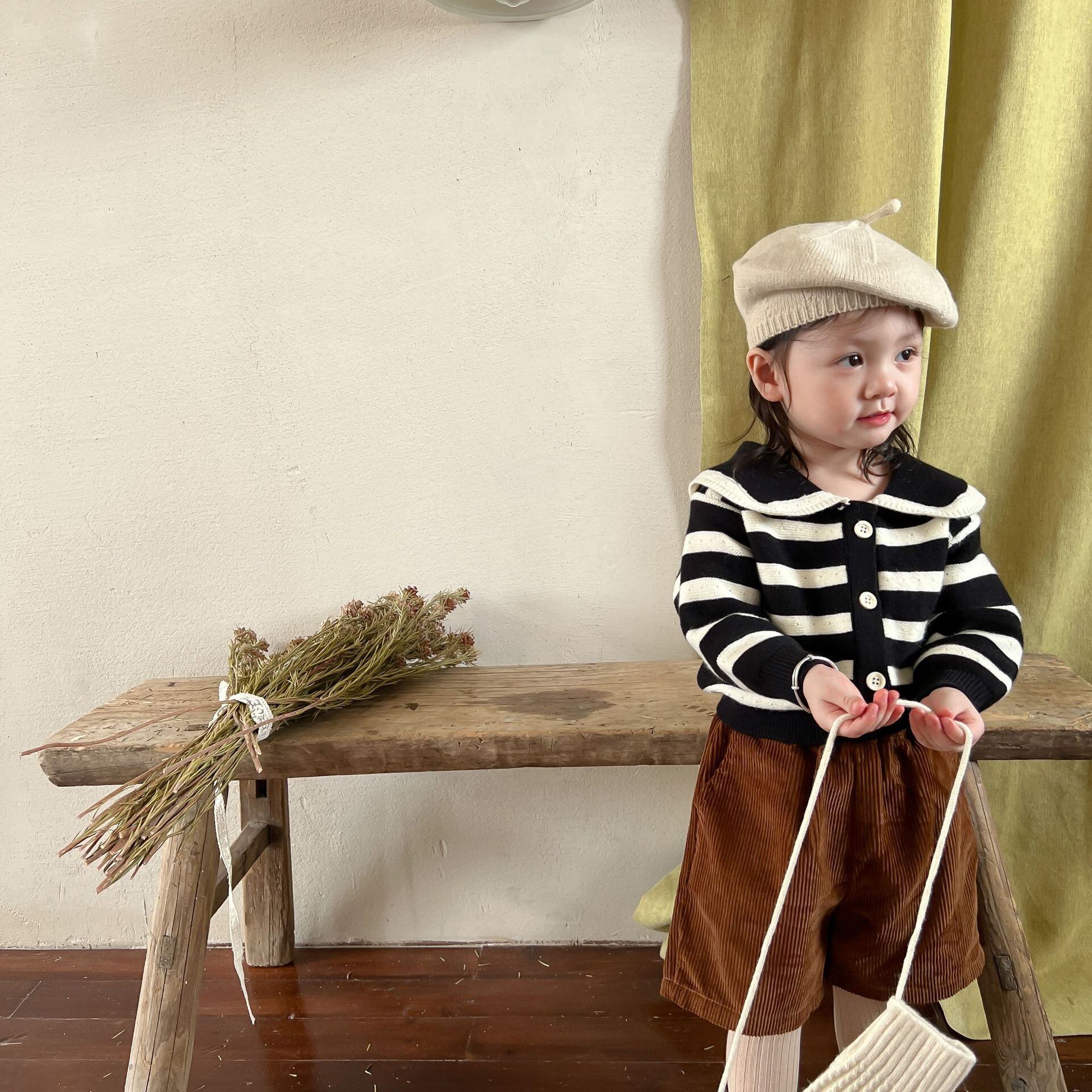 色:ブラックストライプセーター,コーデュロイショーツ