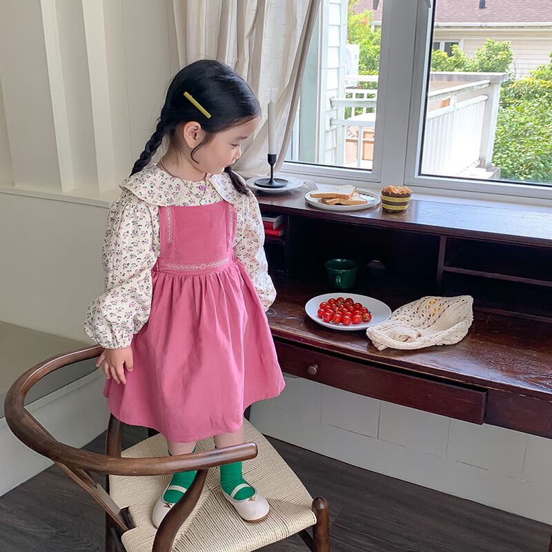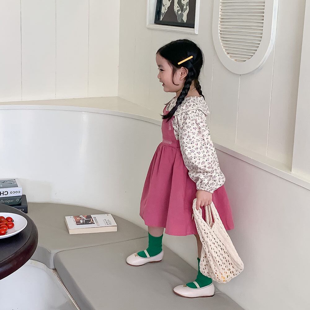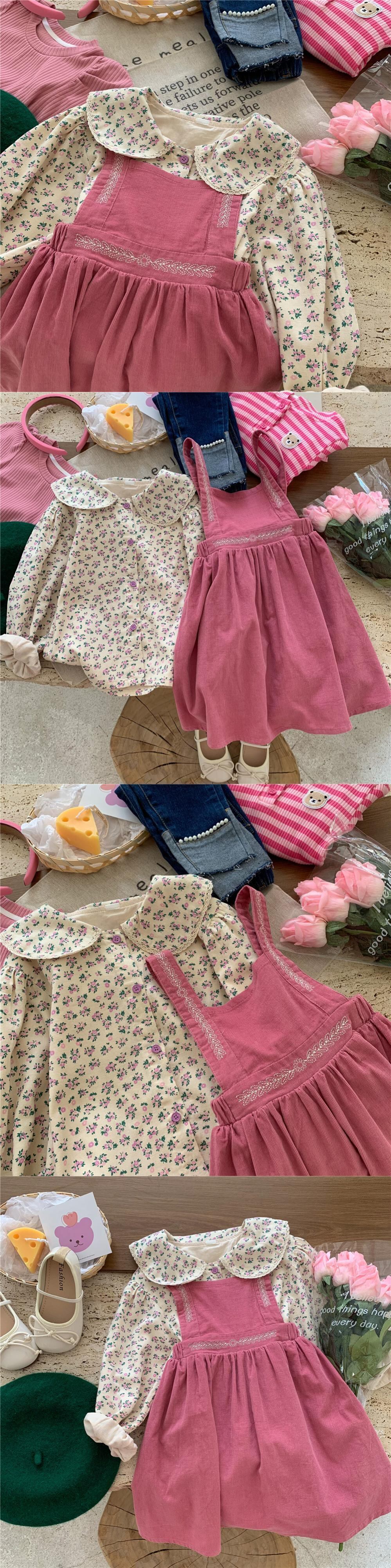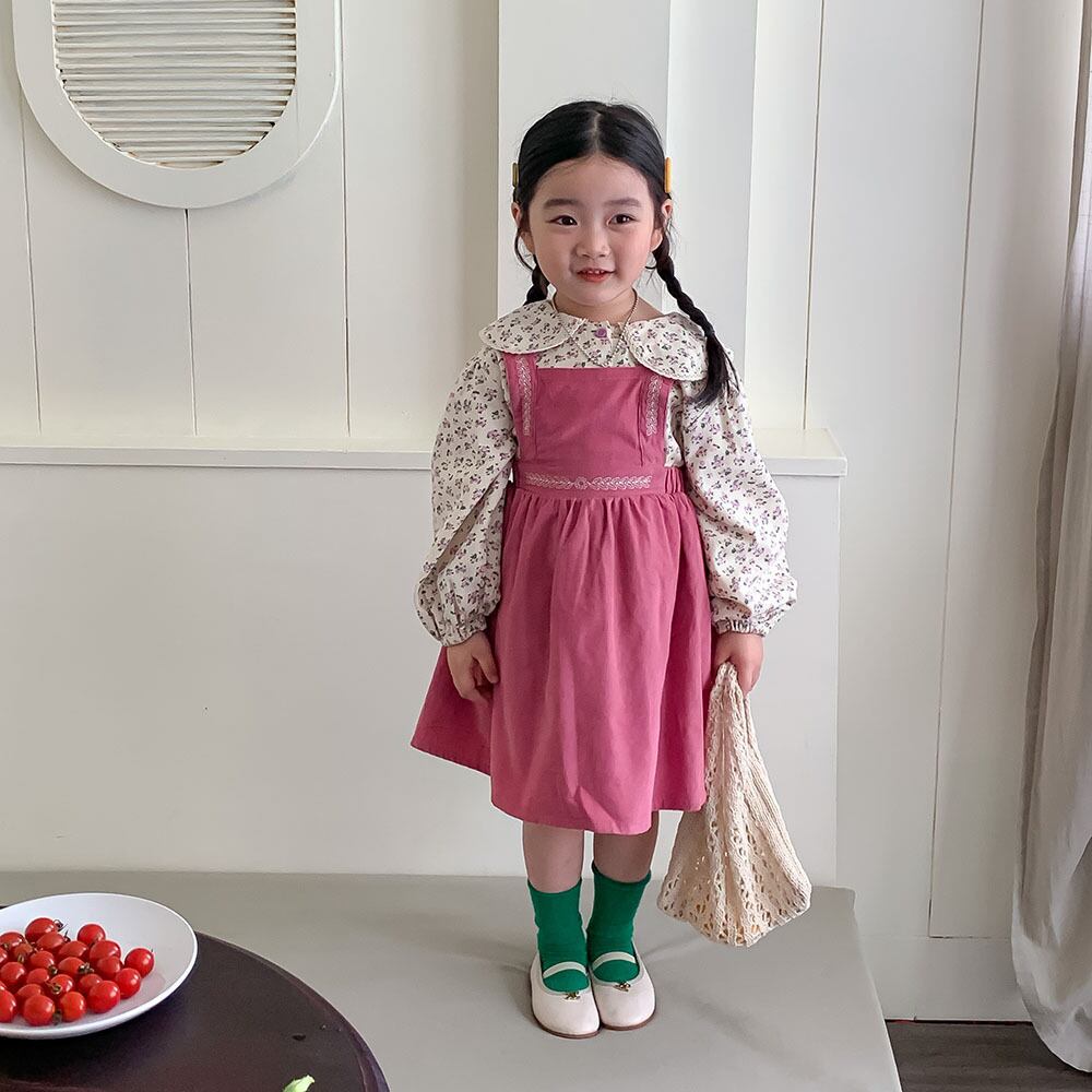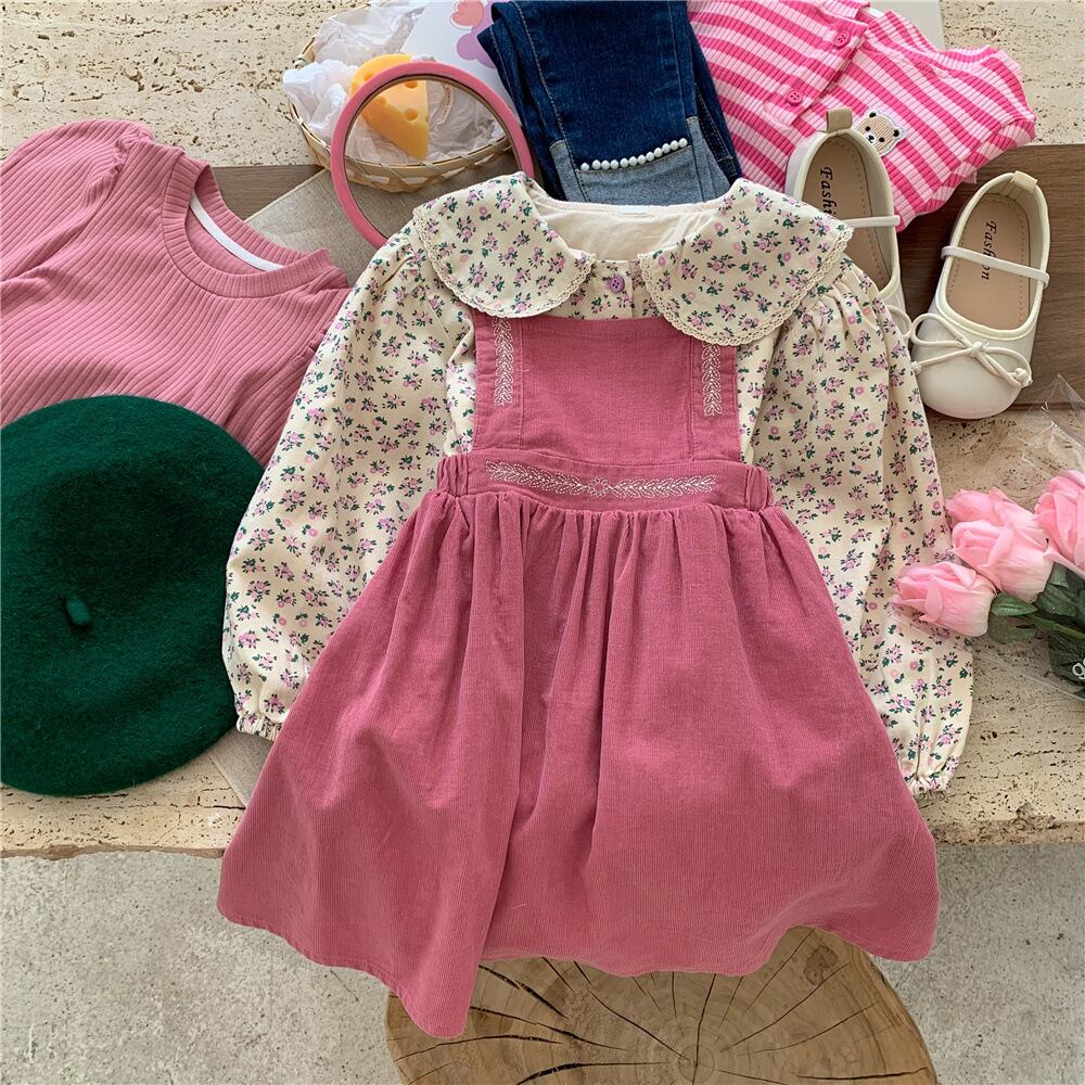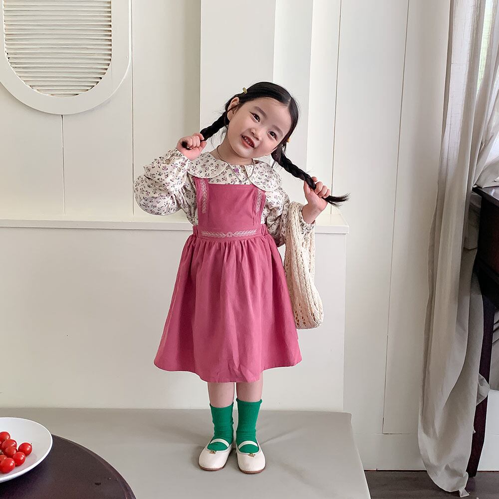 色:ピンクのサスペンダースカート,花柄シャツ