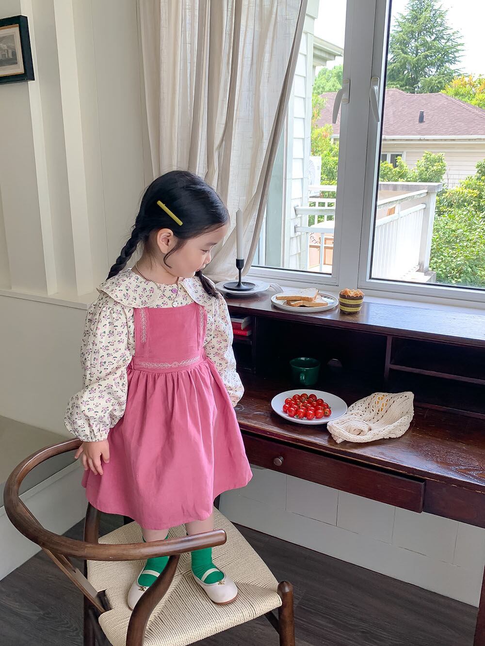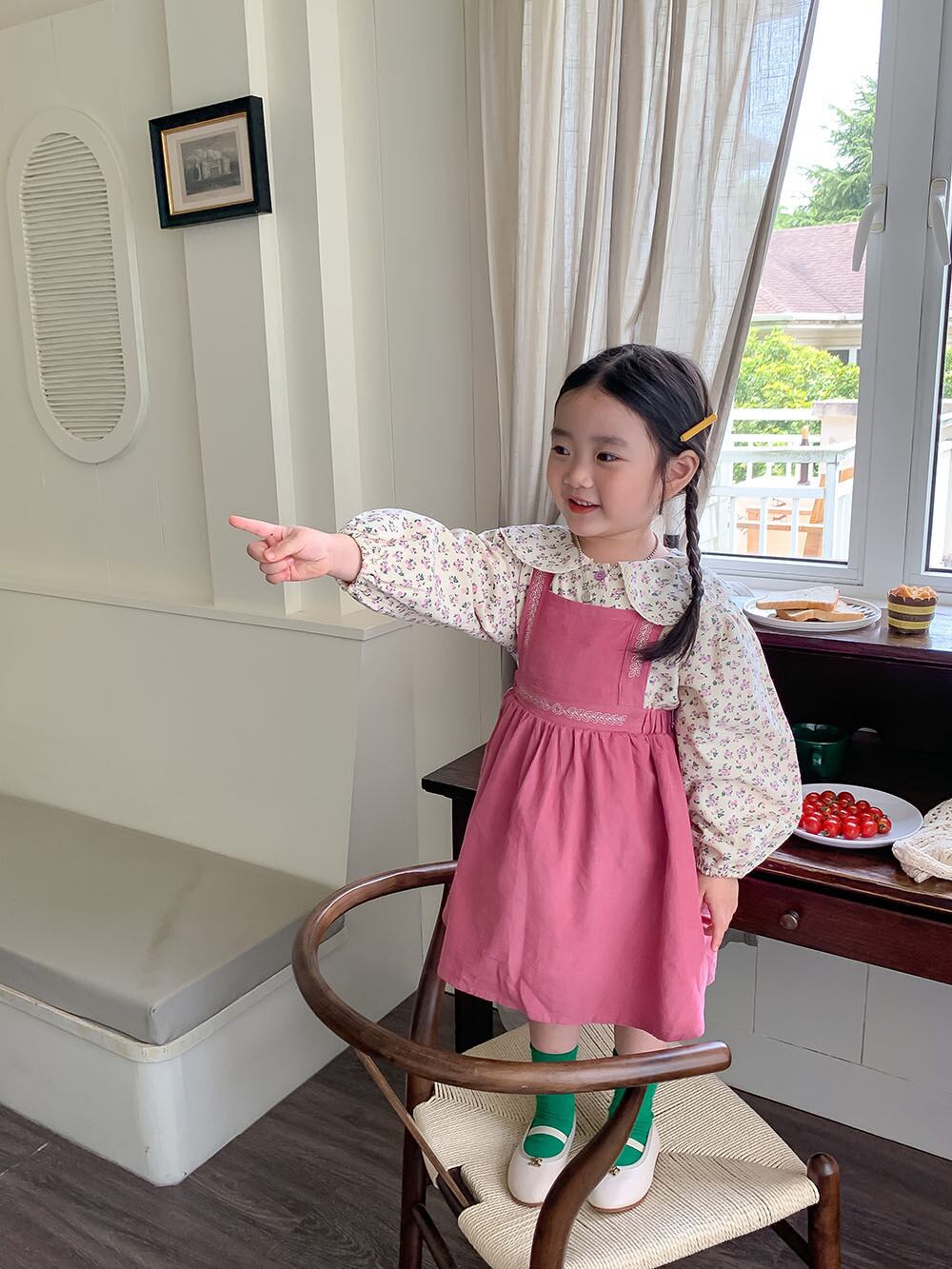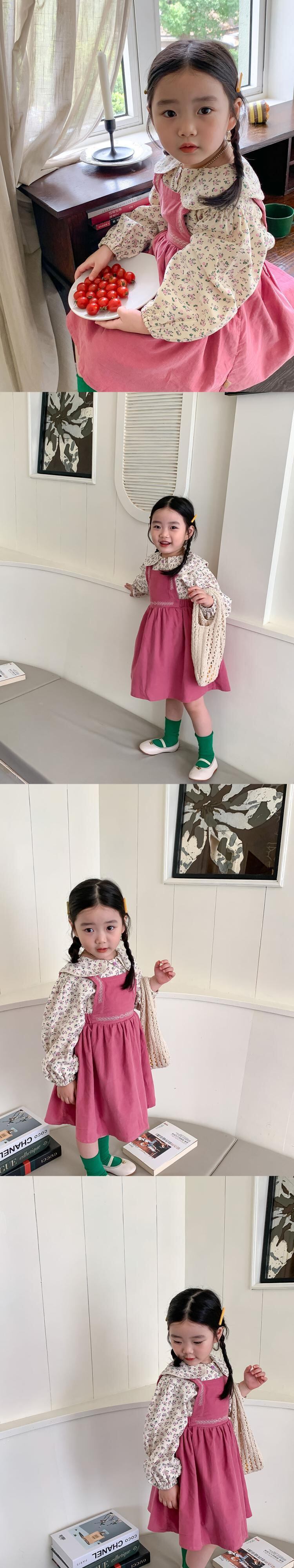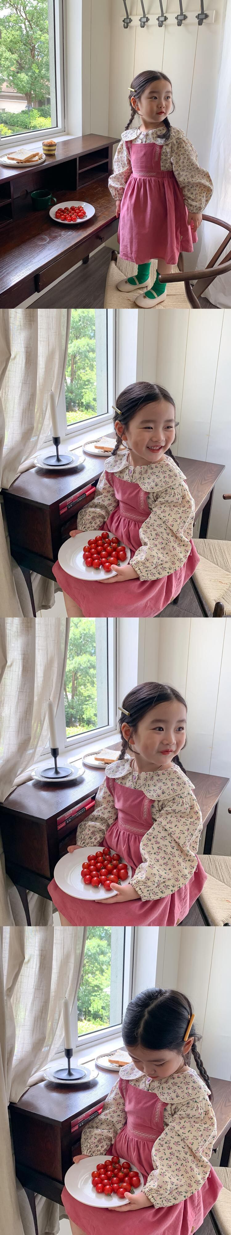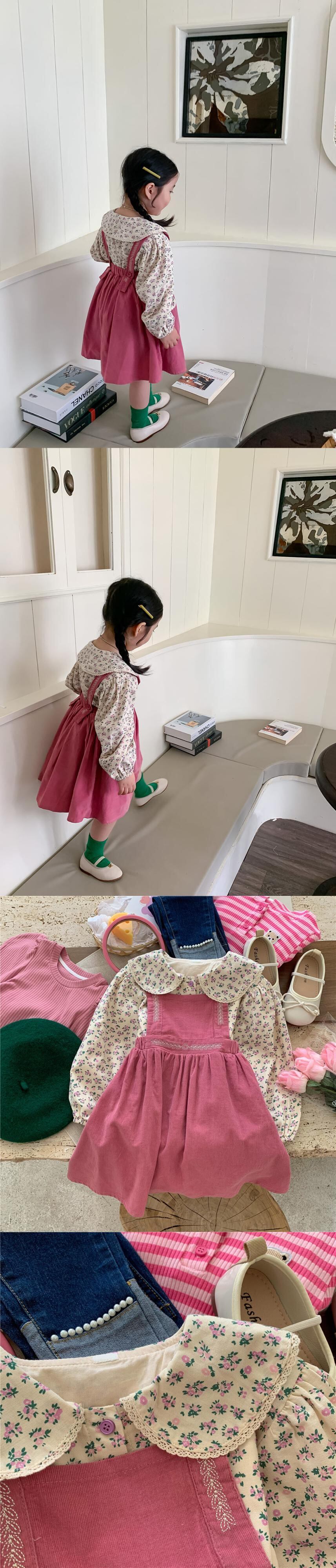 色:ピンクのサスペンダースカート,花柄シャツ
