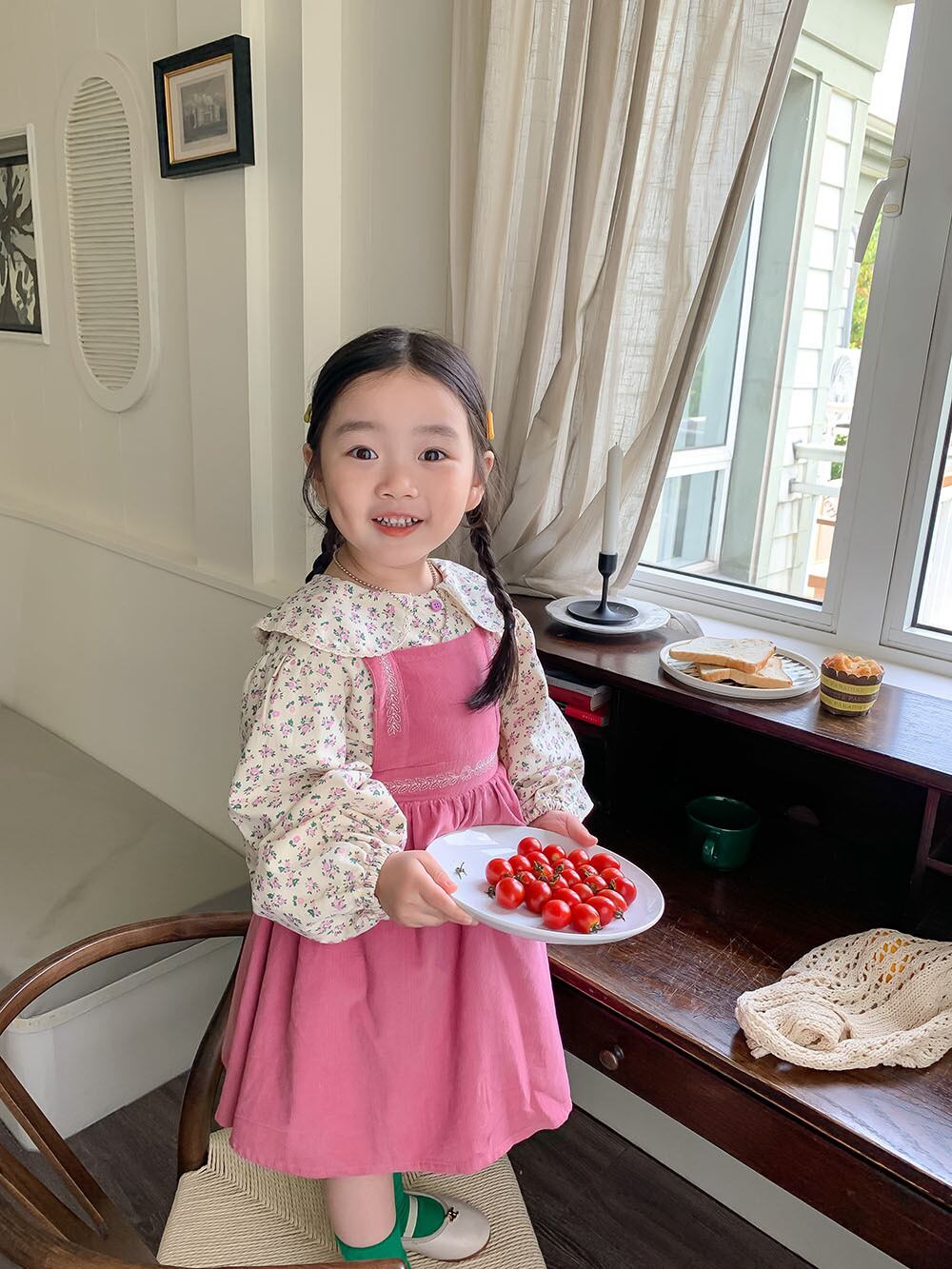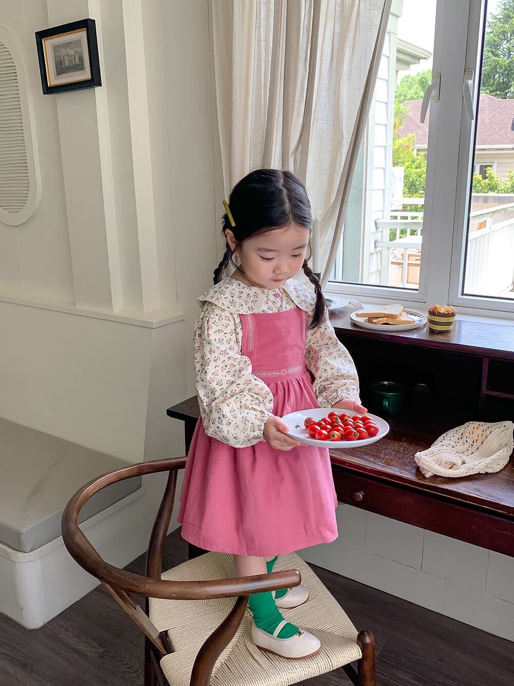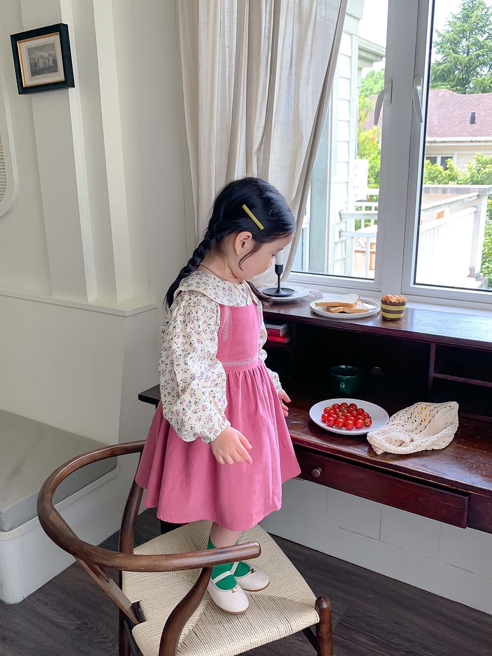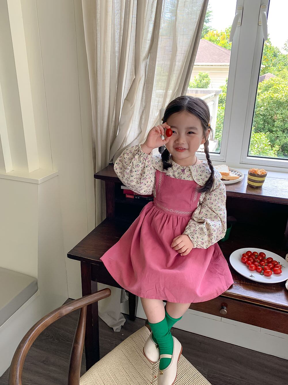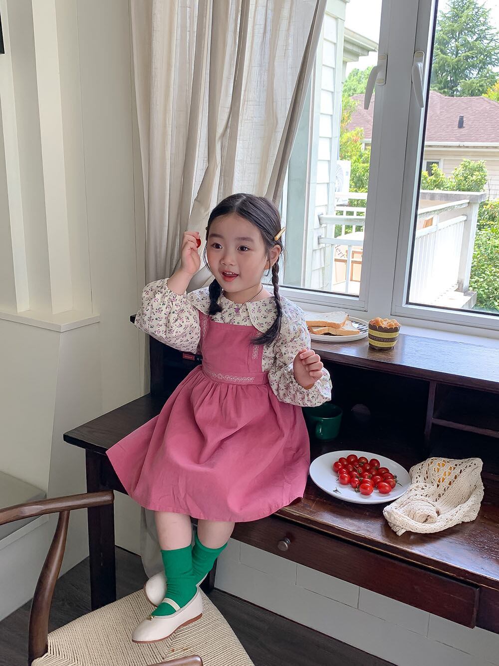 色:ピンクのサスペンダースカート,花柄シャツ