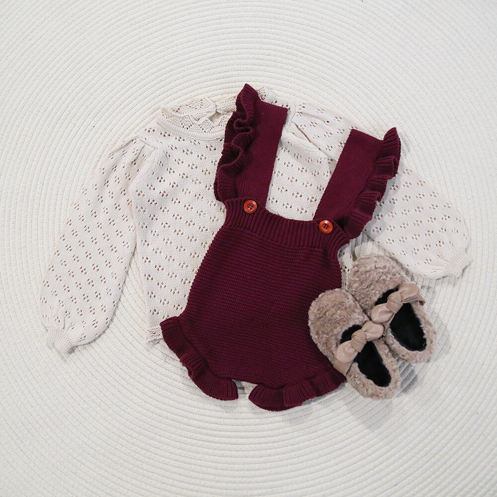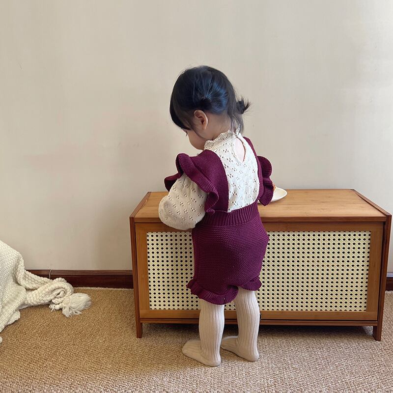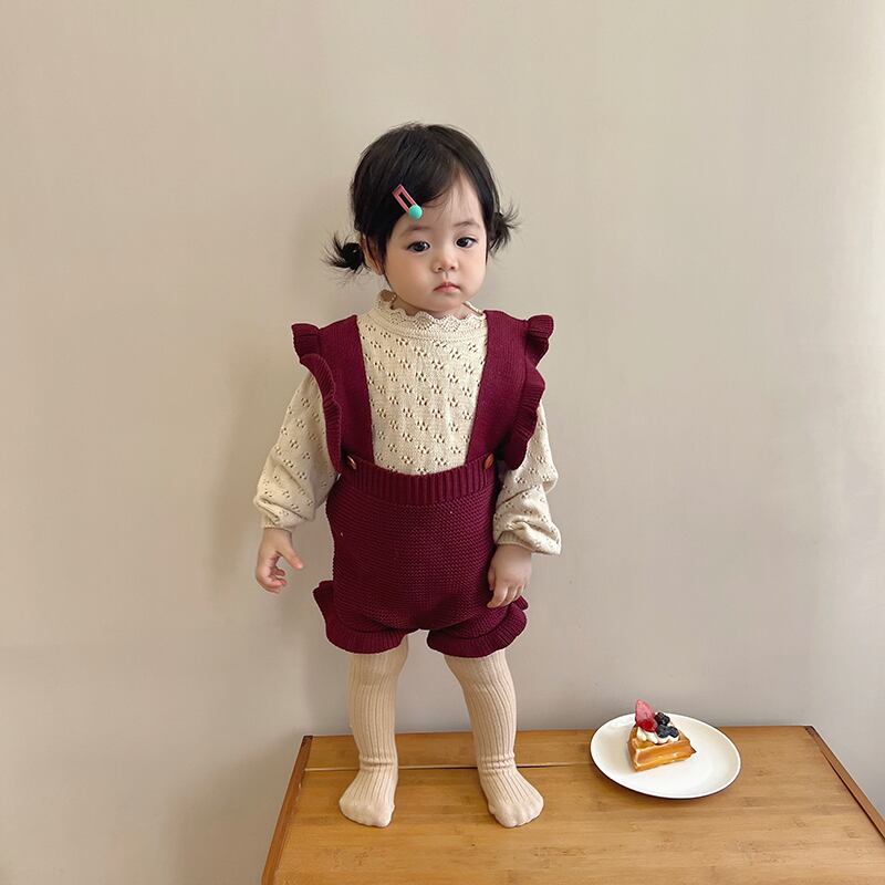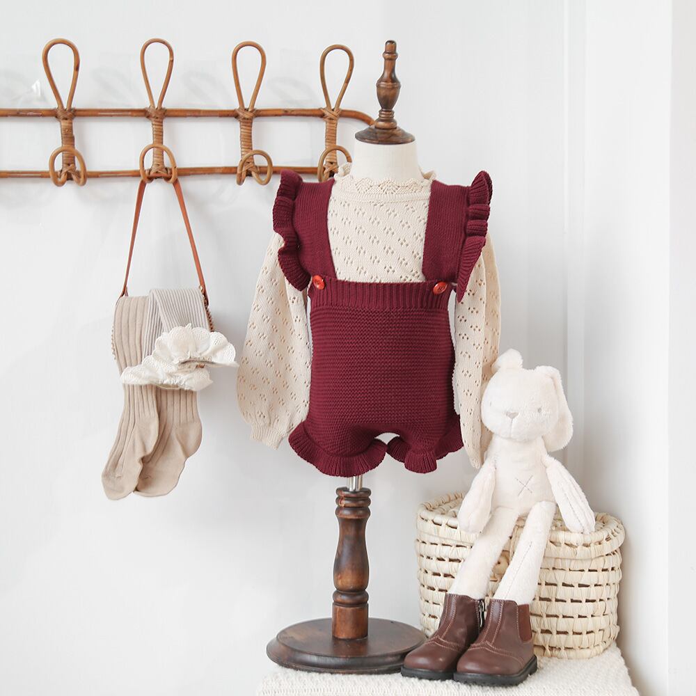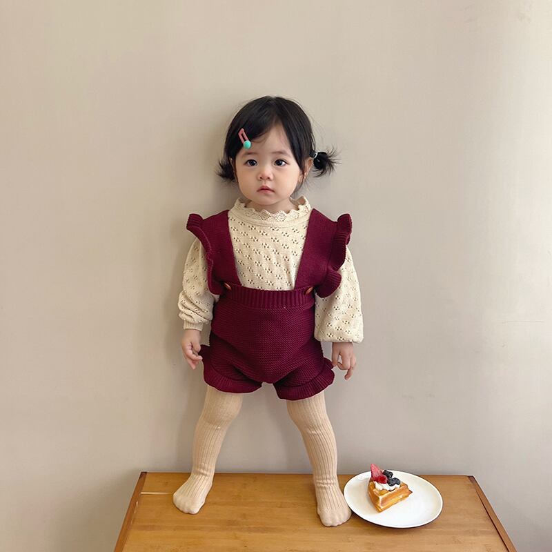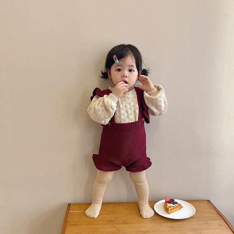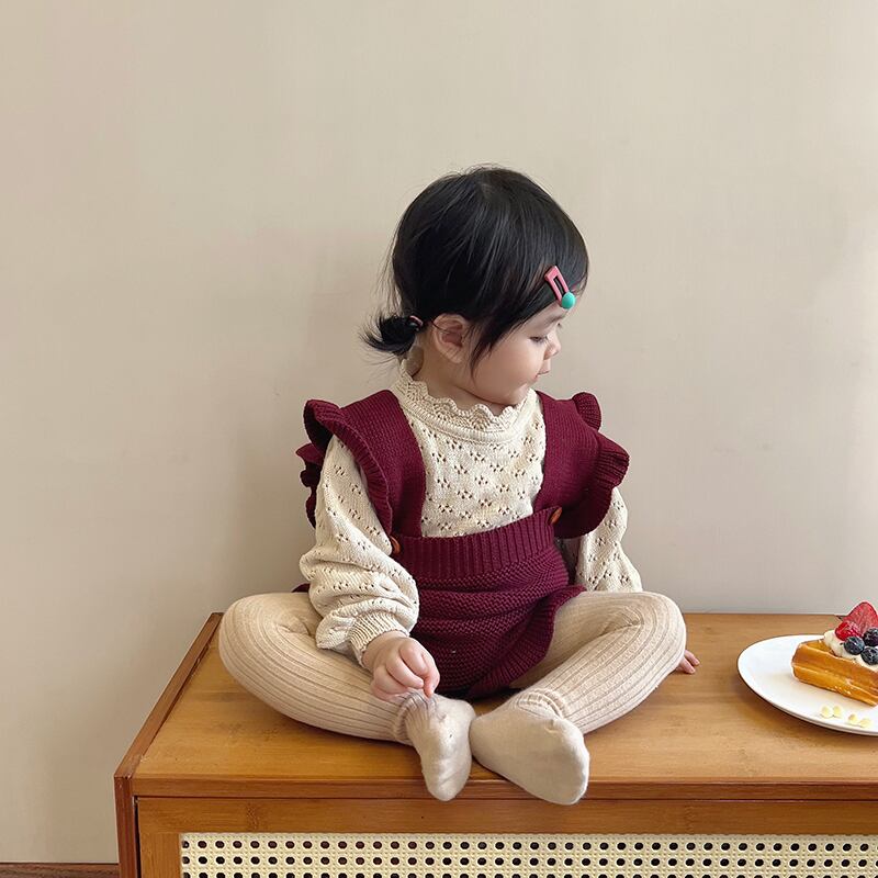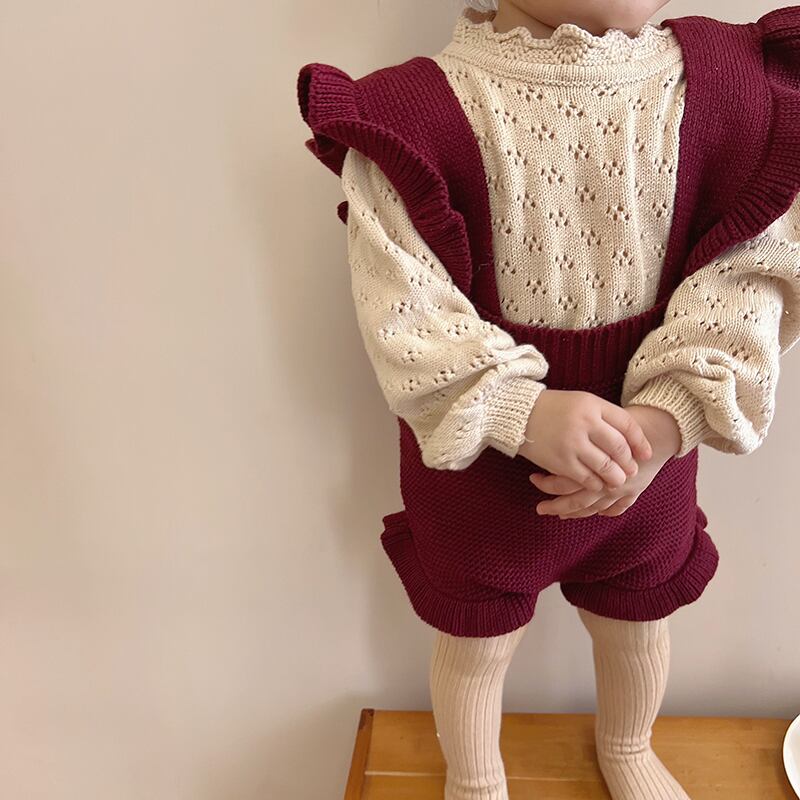 色:ブルゴーニュのオーバーオール,ベージュカットアウトニットセーター