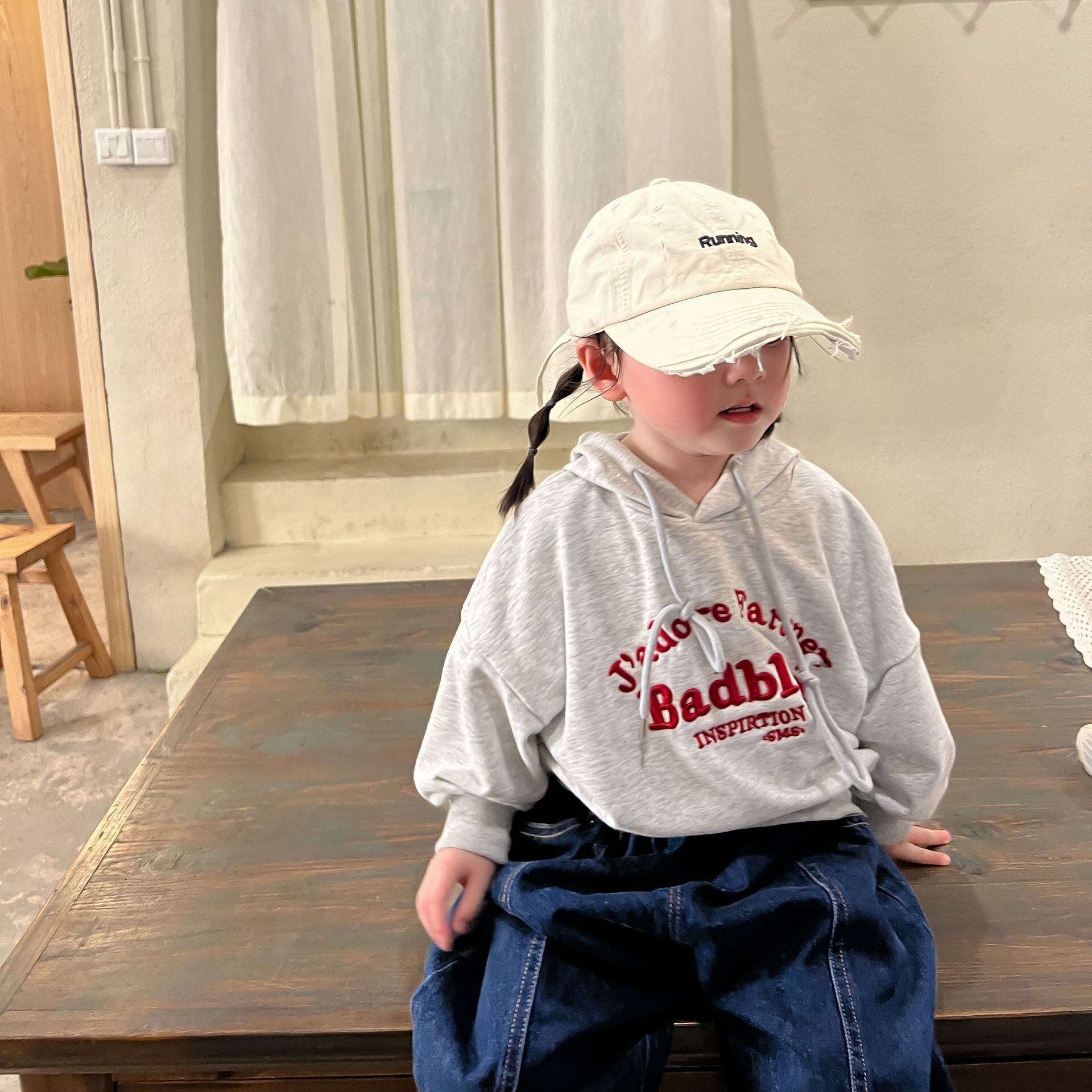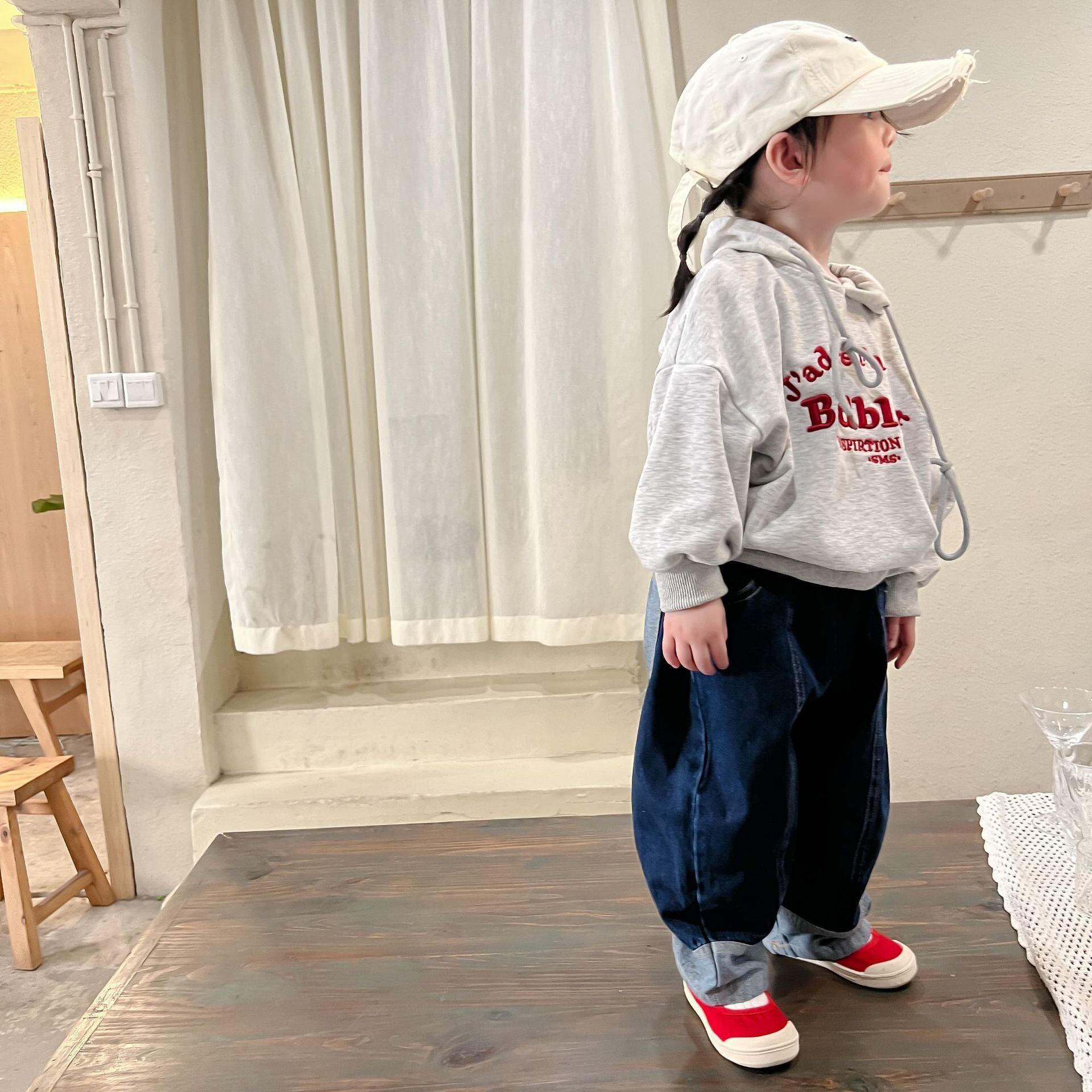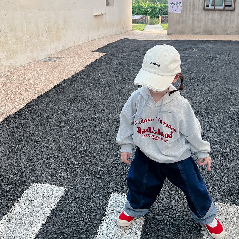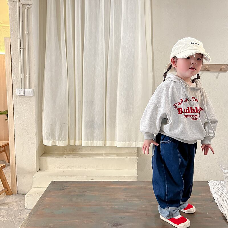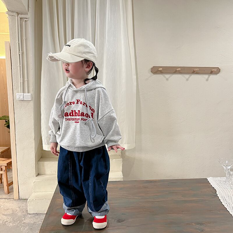 色:グレーのセーター,ジーンズ