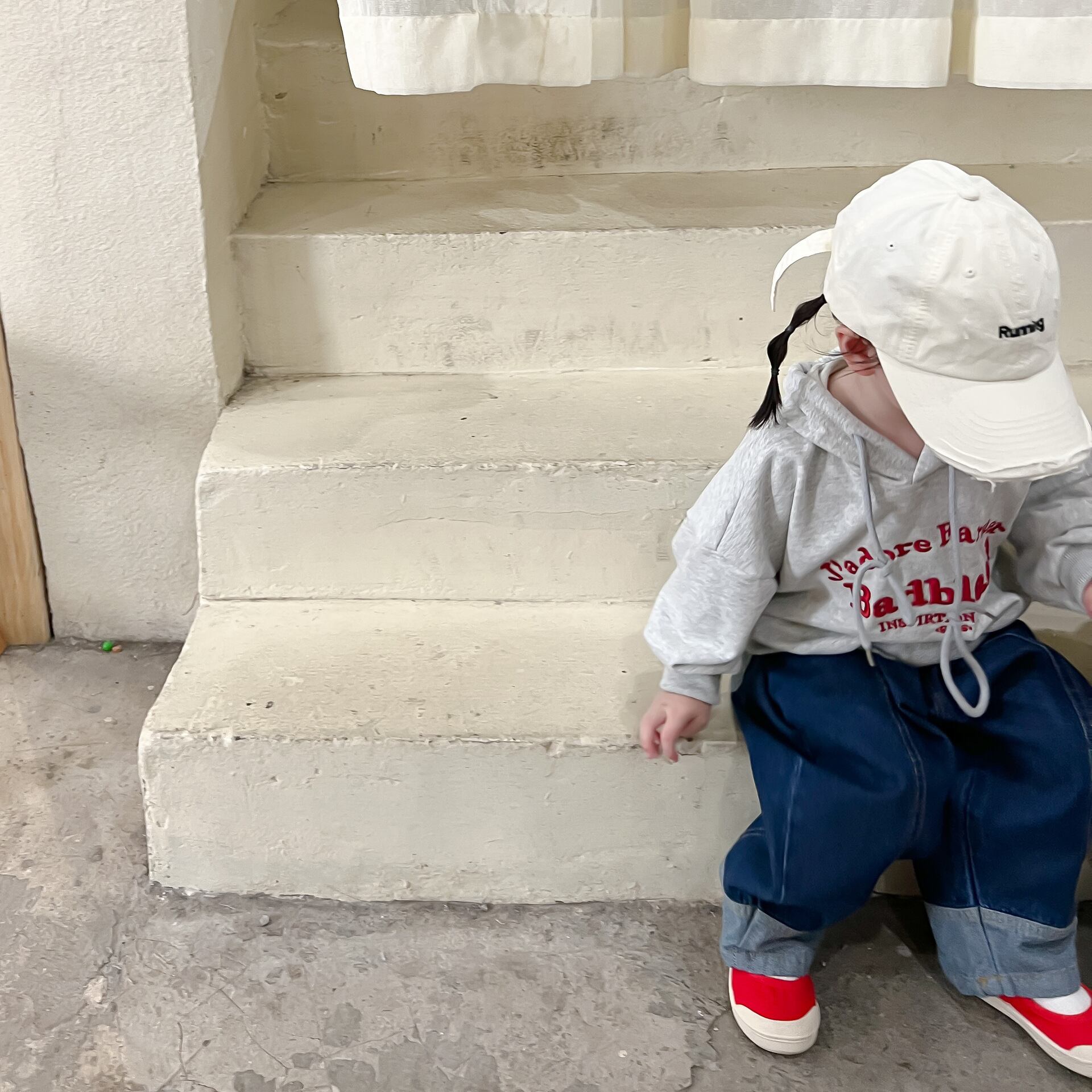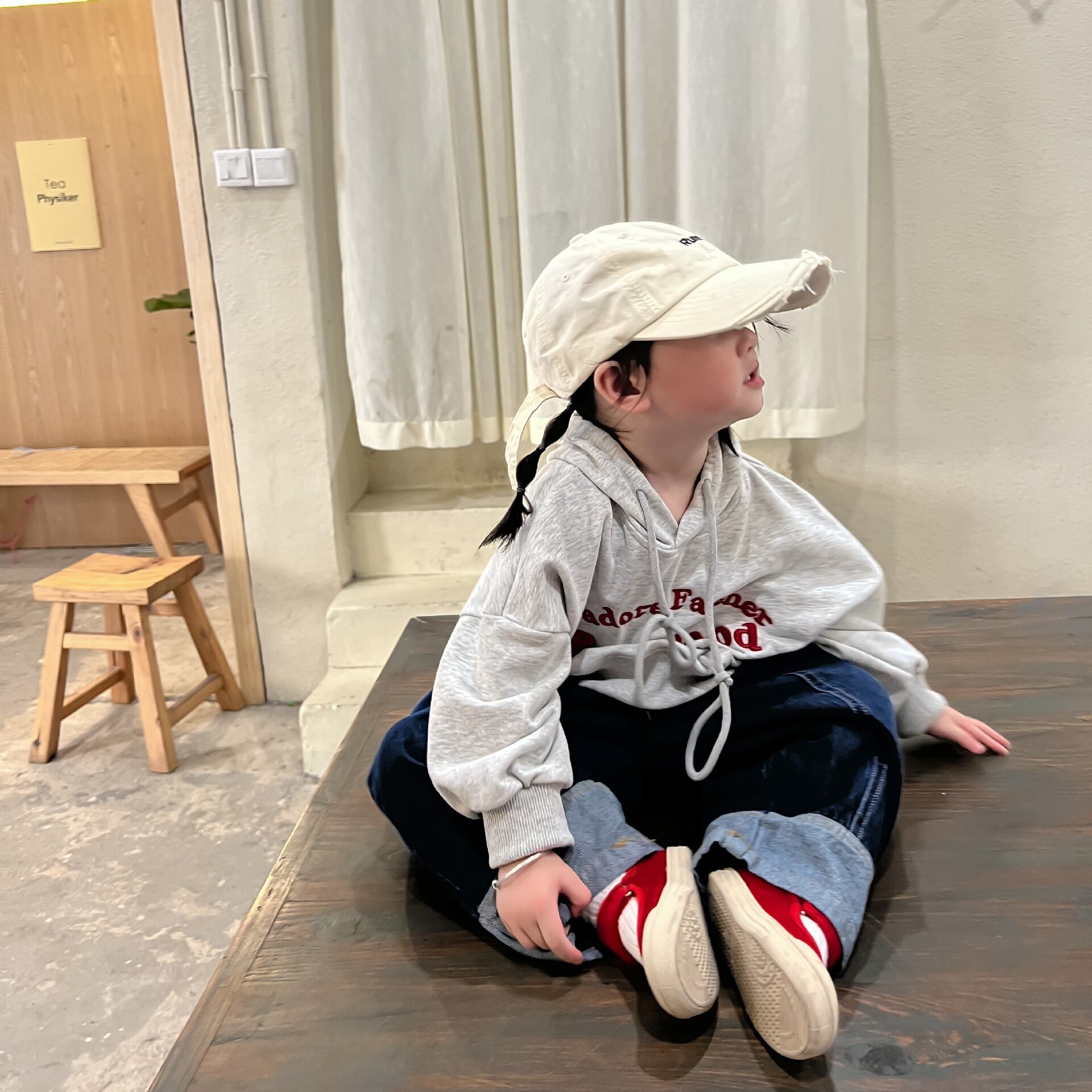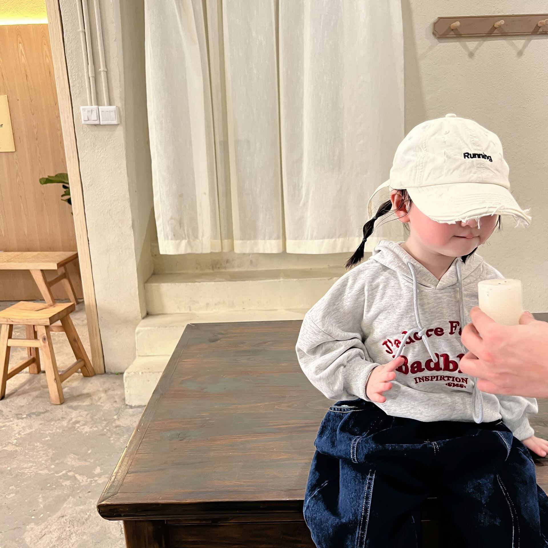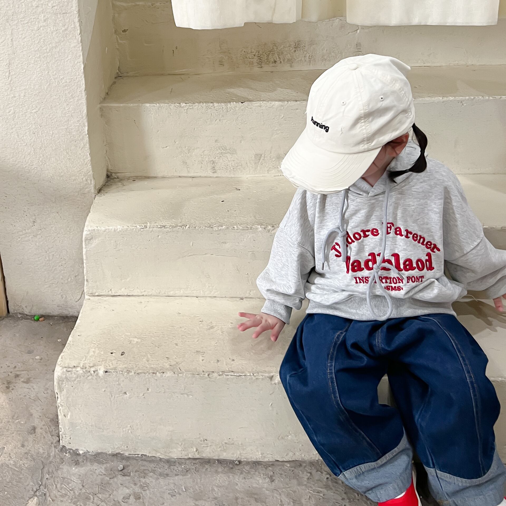 色:グレーのセーター,ジーンズ